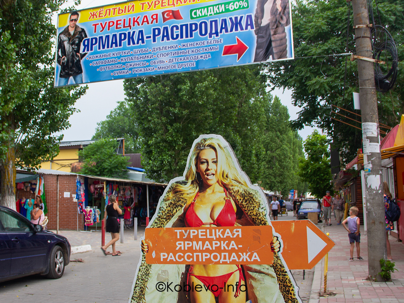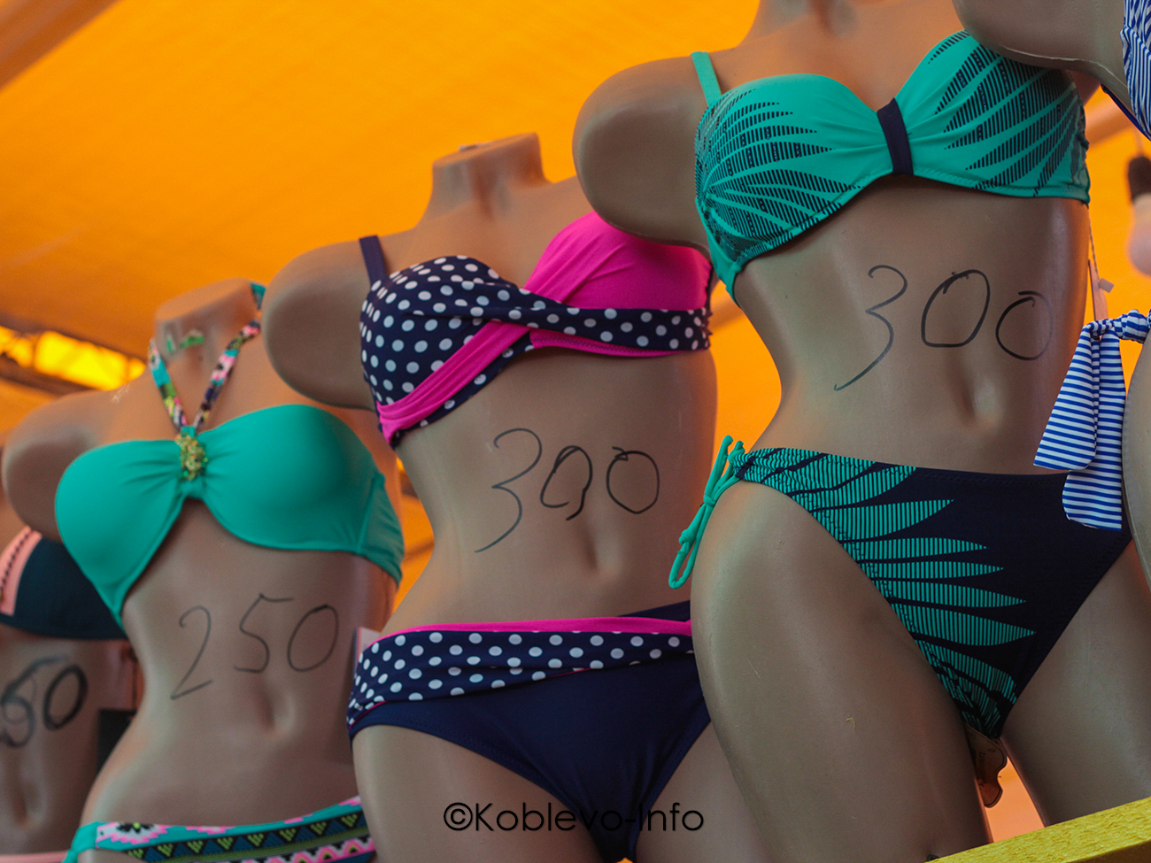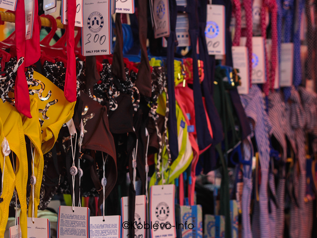 В Коблево летом действительно можно купить любую одежду. Цены рассчитаны на любой бюджет. Джинсы, например, можно купить от 300 до 1500 гривен. Купальники стоят от 300 гривен. Но если хотите сэкономить — отправляйтесь на Турецкий желтый рынок в Молдавской части курорта за супермаркетом «Марка». Ассортимент поражает (цены указаны в гривне):