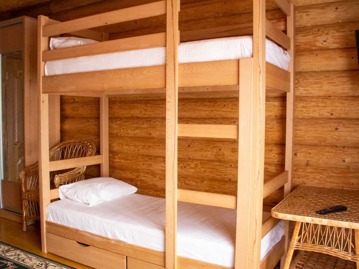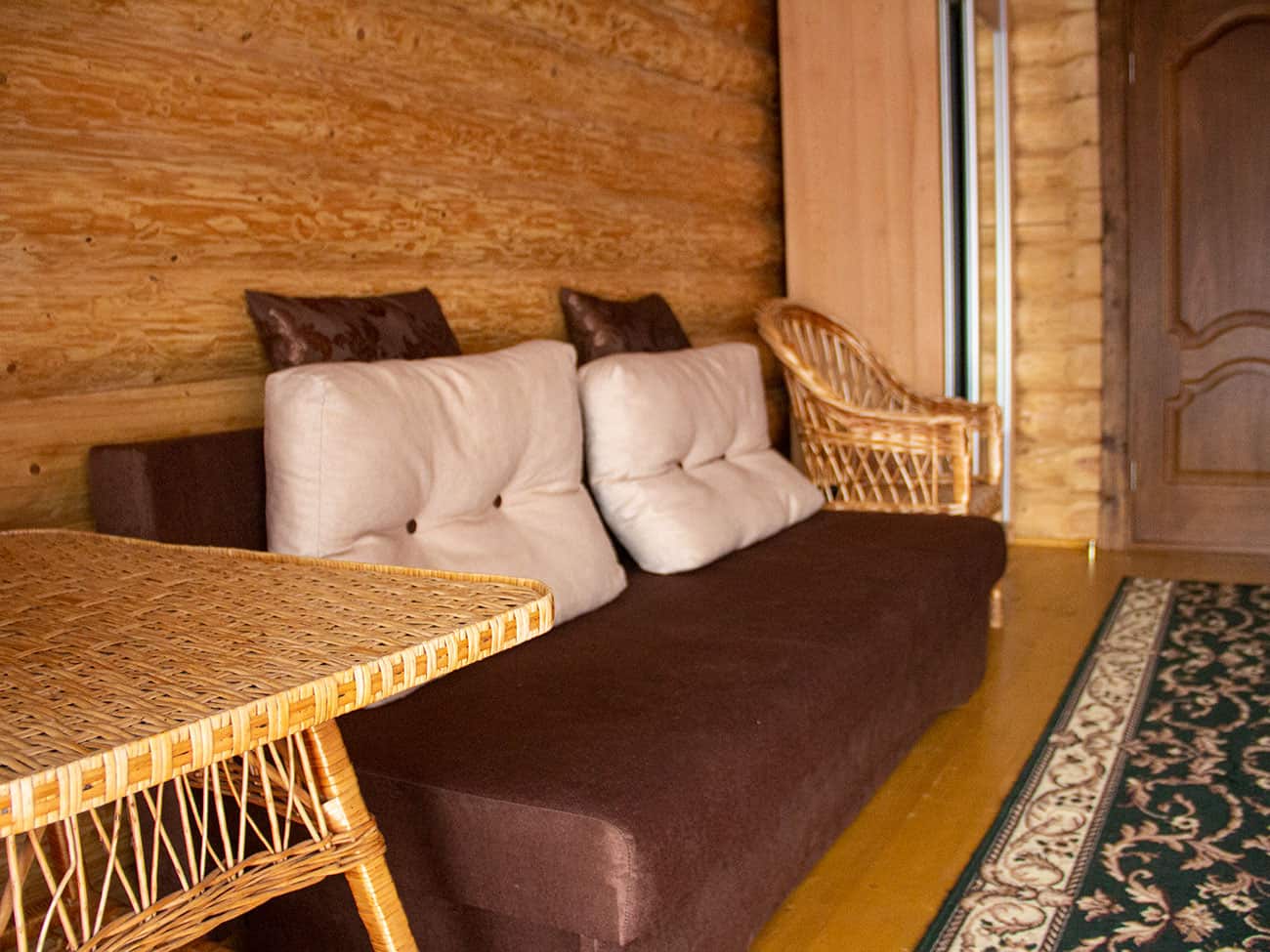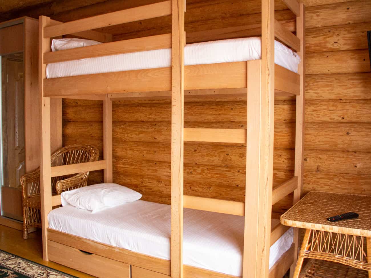 Гостям отель предлагает один из номеров в двухэтажном корпусе из деревянного сруба. Номера на втором этаже имеют выход на просторные балконы. Нам посчастливилось остановиться на первом этаже. Вход в общий коридор приятно пахнет деревом. Что примечательно, в отеле постояльцам выдают электронные ключ-карты. Это очень удобно, потому что дверь открывается буквально за секунду. Нам предложили номер с двухспальной и двухъярусной кроватью. Для нашей команды как раз всё подошло!
