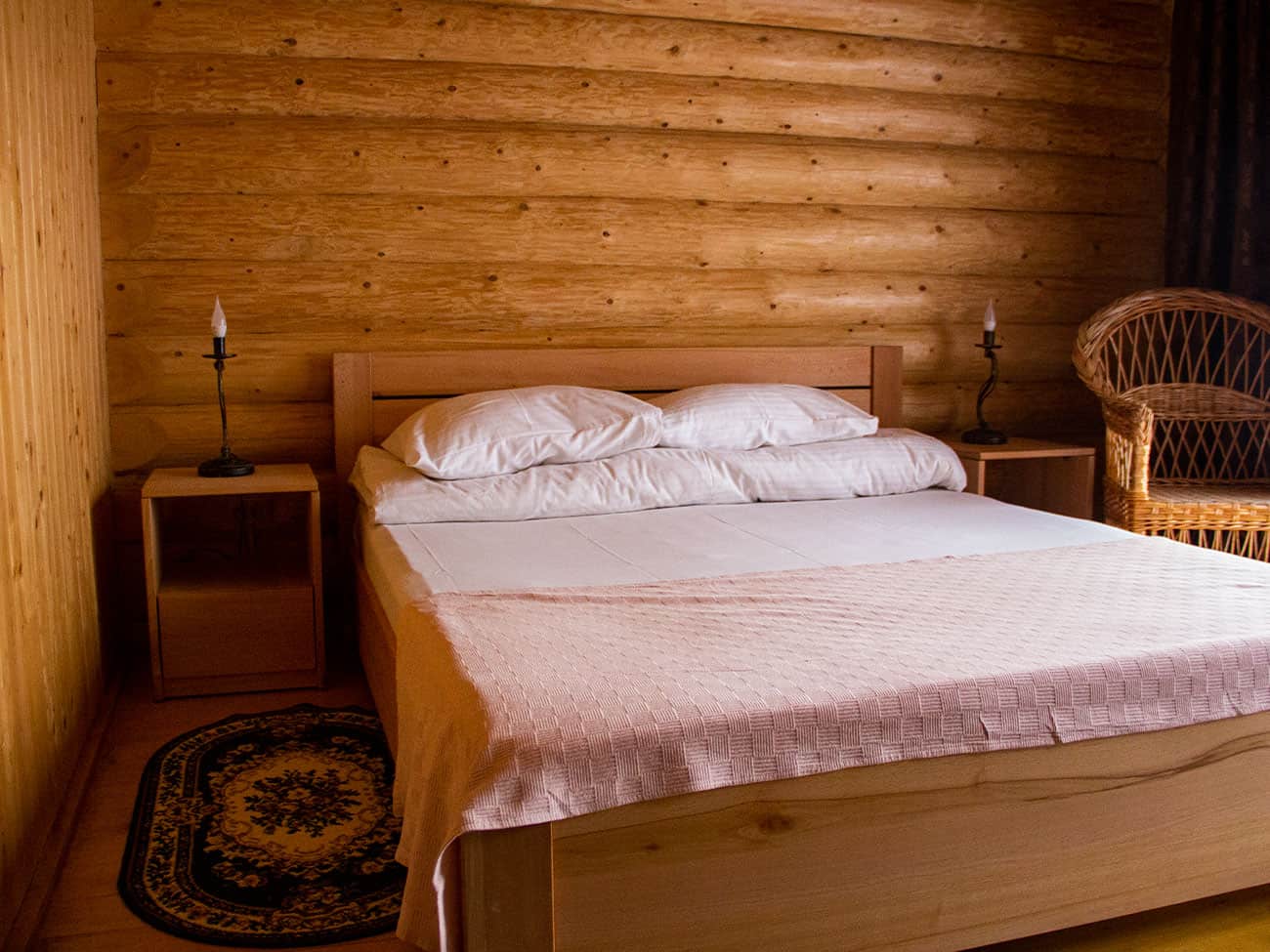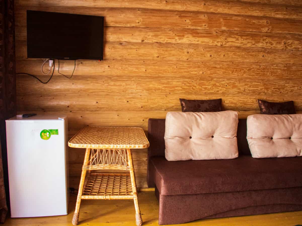 Первое, на что мы обратили внимание — это интерьер. Отель Эко Черное Море выдержал все элементы карпатского интерьера. Стены из дерева как будто излучают уют. Стоит отметить, что тут побеспокоились о безопасности. Круглосуточно работают датчики дыма и пожарная сигнализация. Здания ведь деревянные. Но вернемся к нашему номеру. В пользовании гостей платяной шкаф с зеркальными дверями, ротанговый стол и два кресла. Для нас крайне важно наличие стола, потому что наша команда постоянно в деле и за компьютером. Огромным бонусом на первом этаже бесспорно станет панорамное окно. Оно же может сыграть роль двери с выходом на территорию.