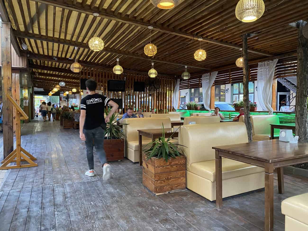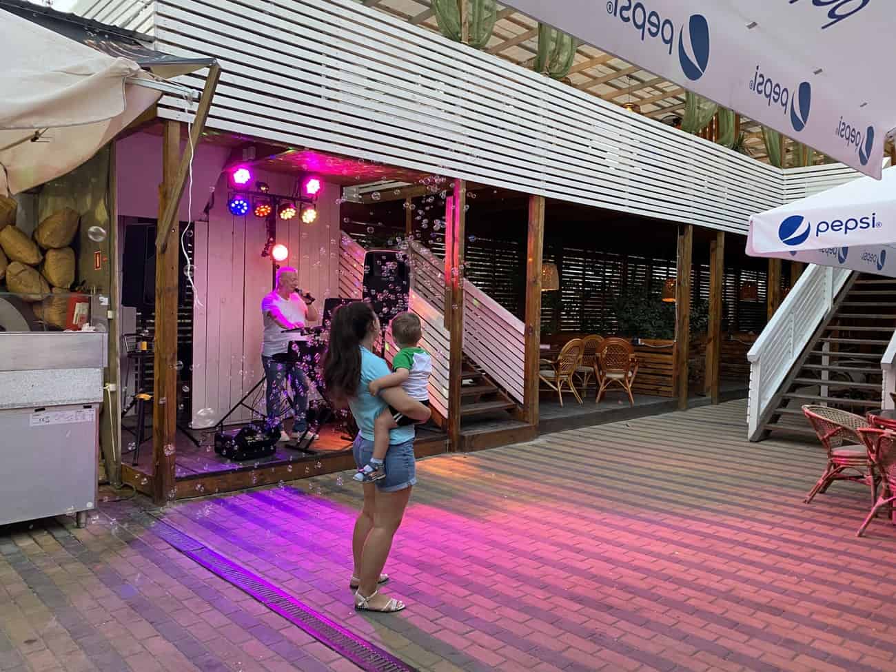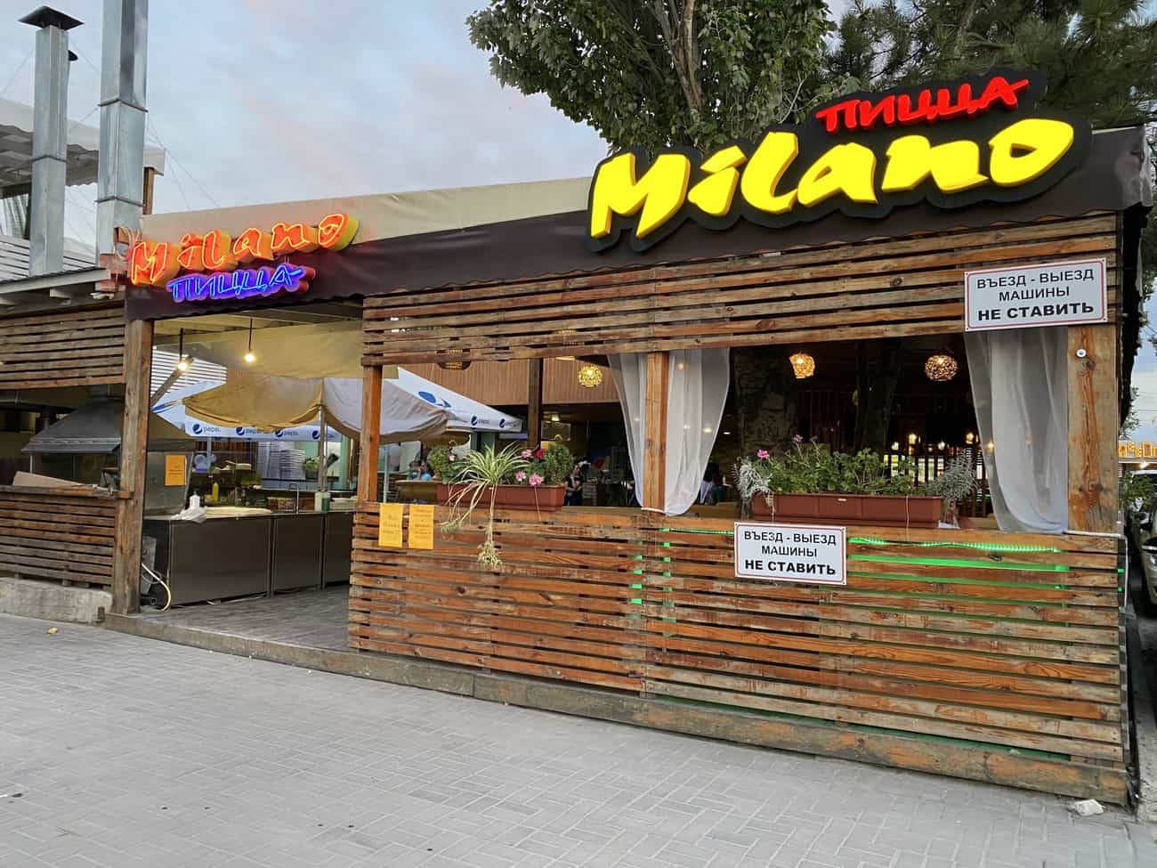 Кстати, напротив отеля расположился пицца-ресторан Милано в Коблево. Здесь постояльцы Ресорт Марин, несмотря на наличие кухни, любят собираться компаниями за вкусным ужином. С наступлением заката в пицца-ресторане играет живая музыка и поет музыкант. В Коблево 22.07.2020 нам удалось запечатлеть чудесную вечернюю атмосферу Милано.