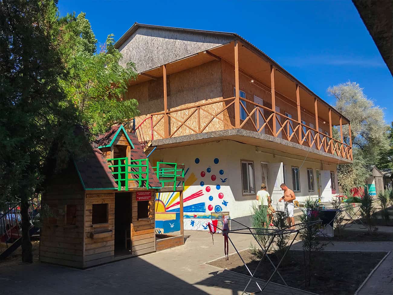 Стоит отметить, что база отдыха Лазурный в Коблево больше похожа на коттеджный комплекс. А именно, потому что здесь есть каменные и деревянные домики. В 2-этажных домиках есть 2-х и 3-местные номера. На самом деле, такой вариант жилья отлично подойдет для большой компании с возможностью арендовать весь коттедж. Санузел, кстати, есть на каждом этаже. В комнатах — кровати и другая мебель для комфортного проживания. Холодильник находится на первом этаже. Также для проживания предоставляются несколько корпусов: