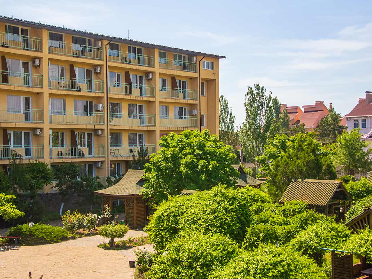 Номера в отеле представлены как в 5-этажном основном здании, так и в отдельно стоящих коттеджах из 3-х и 2-х этажей, рассчитанных на большую компанию. Естественно, номера, которые предлагает база отдыха Лотос в Коблево, обустроен необходимым набором мебели и техники: