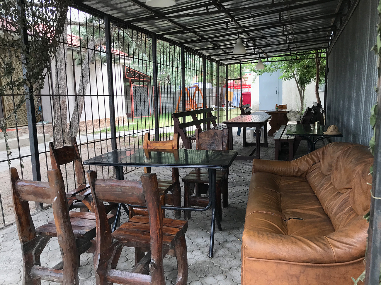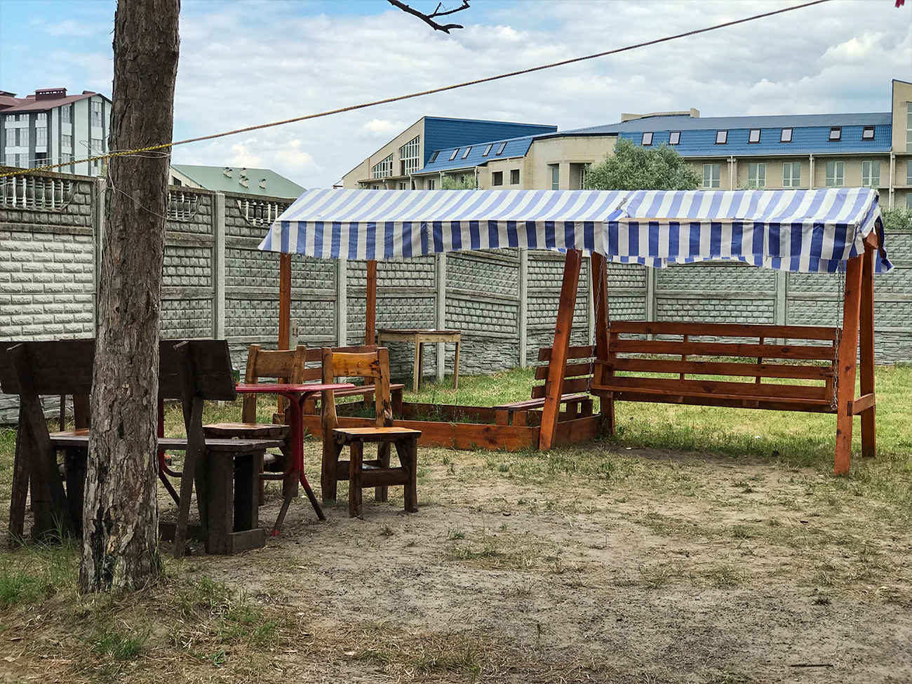Территория, которую туристам предлагает база отдыха Валерия в Коблево, буквально утопает в зелени. По всему периметру растут деревья и кустарники. Есть несколько крытых беседок и мест под зонтиком от солнца со столиками и удобными стульями. Здесь можно с комфортом провести время на свежем воздухе и полакомиться чем-нибудь вкусным. К слову, приготовить еду можно на общей кухне. Там есть все необходимое: