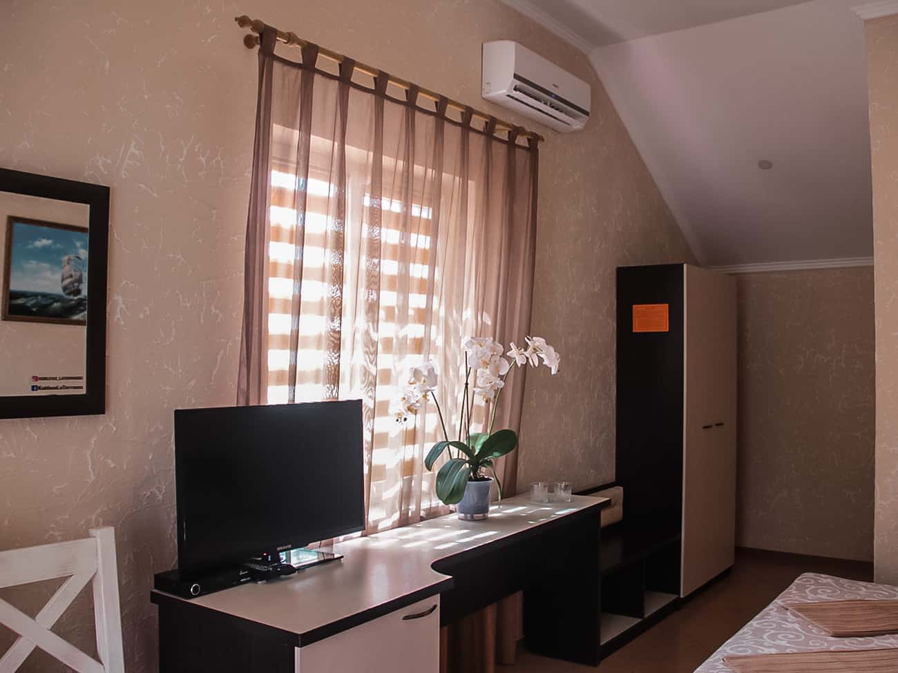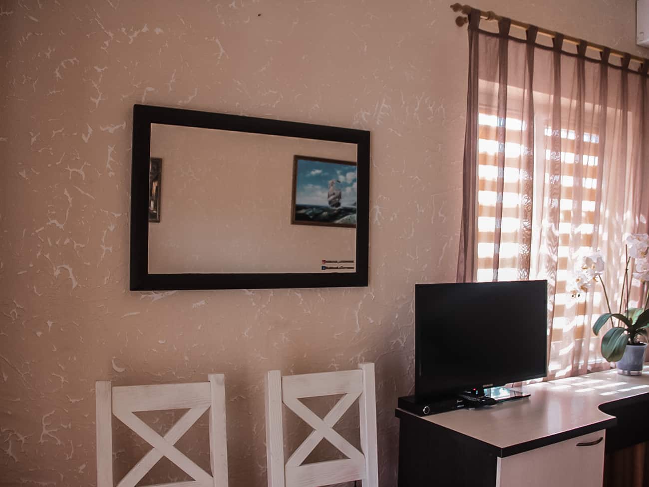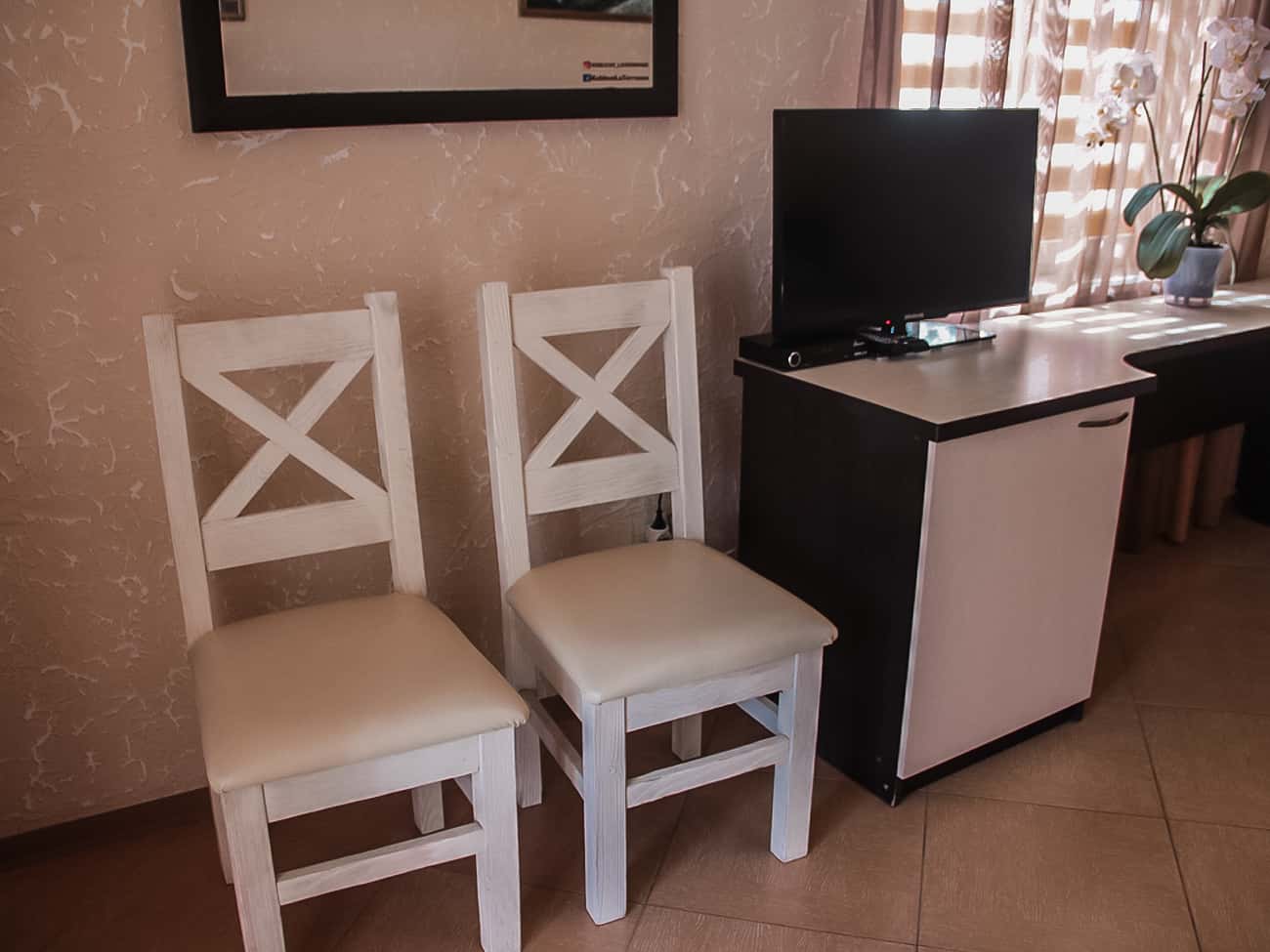 Отель Ла Террасса в Коблево предоставляет услуги по ежедневной уборке комнат и регулярной замене постельного белья. Возле каждого номера есть небольшой столик со стульями. Так что приятным летнем вечером вполне можно провести время, наблюдая за потрясающим закатом.