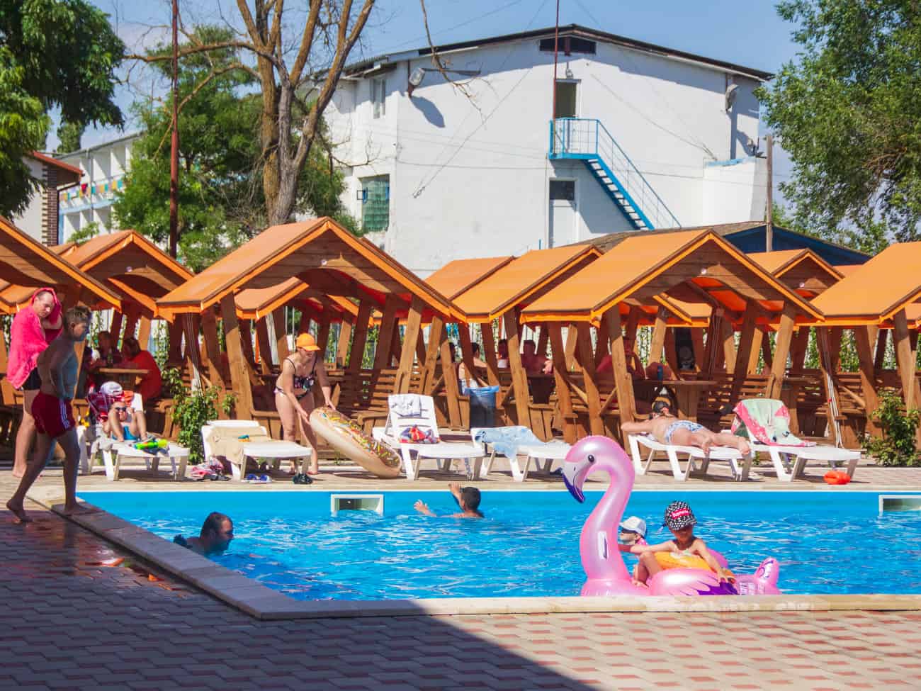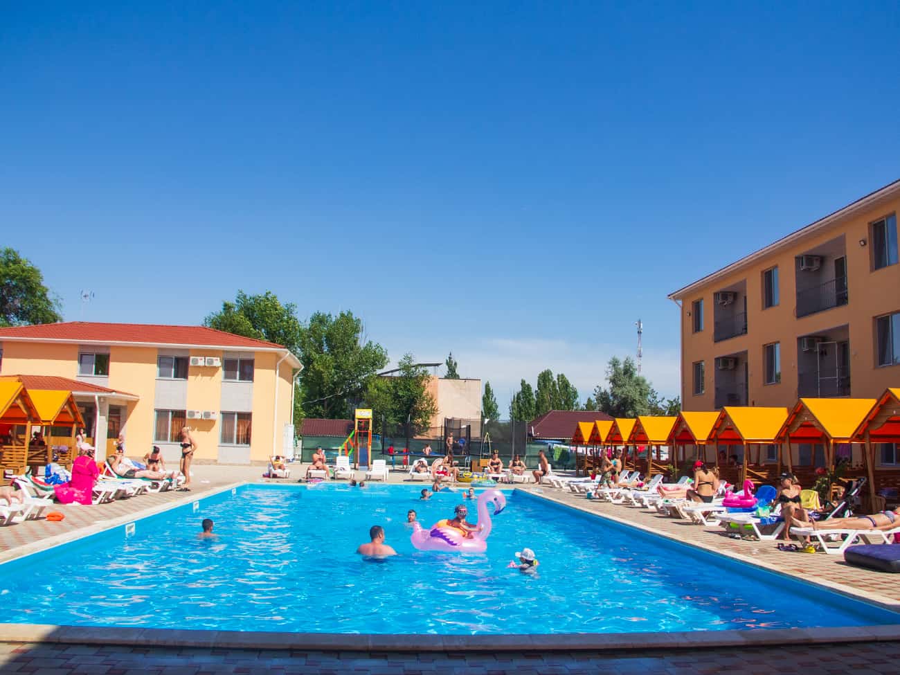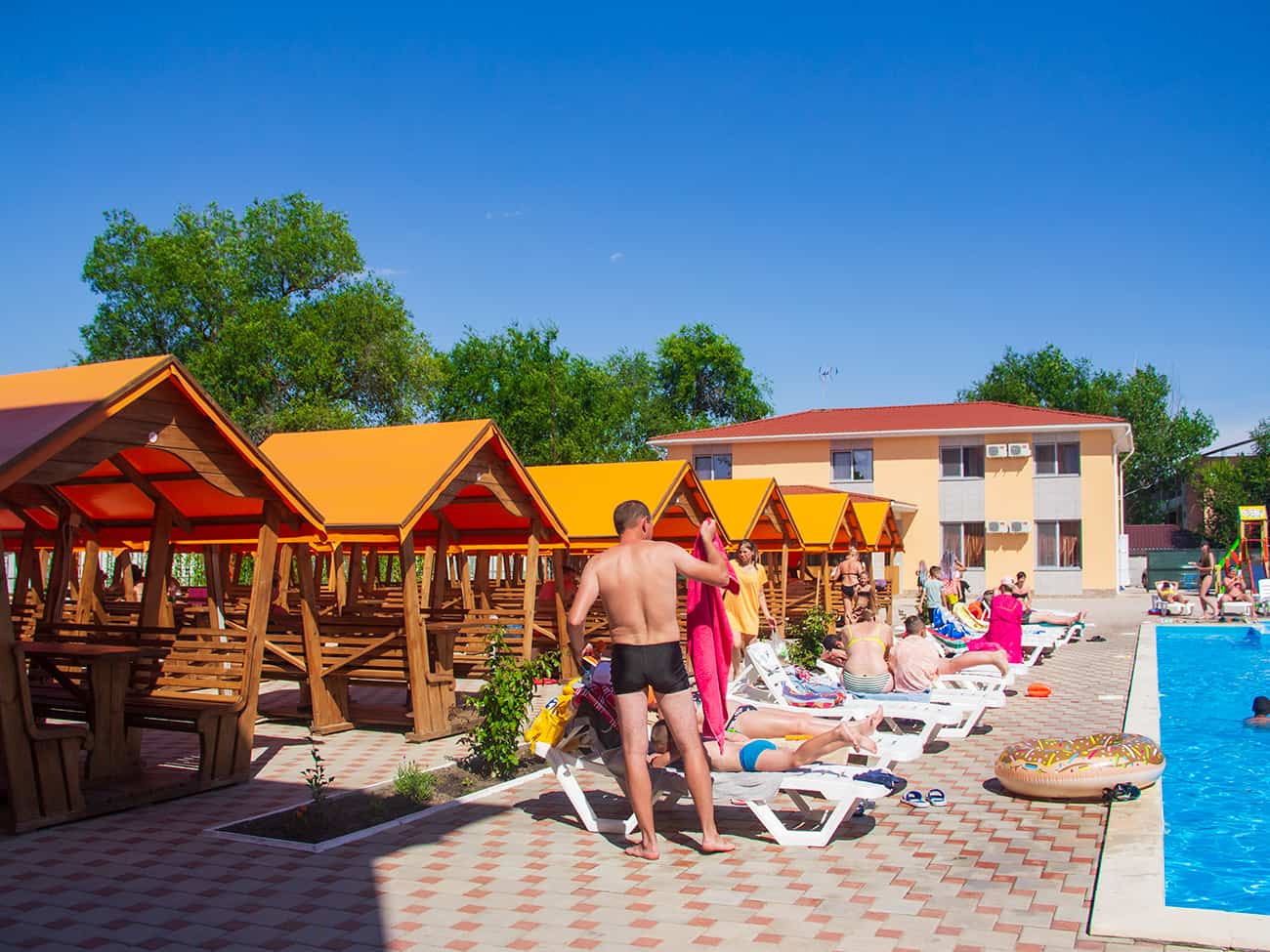 Уютная территория окружена корпусом, который возвел отель Апельсин в Коблево. Именно таким образом защищая постояльцев от посторонних глаз. Здесь в самом центре расположен большой плавательный бассейн. Ночью бассейн подсвечивается. Это создает просто волшебную атмосферу на территории! Стоит отметить, что в бассейне есть отдельная неглубокая детская зона. Так что малыши могут безопасно нежиться в воде, под присмотром взрослых, естественно. Вокруг находятся есть лежаки. Можно также отдохнуть за одной из уютных беседок.