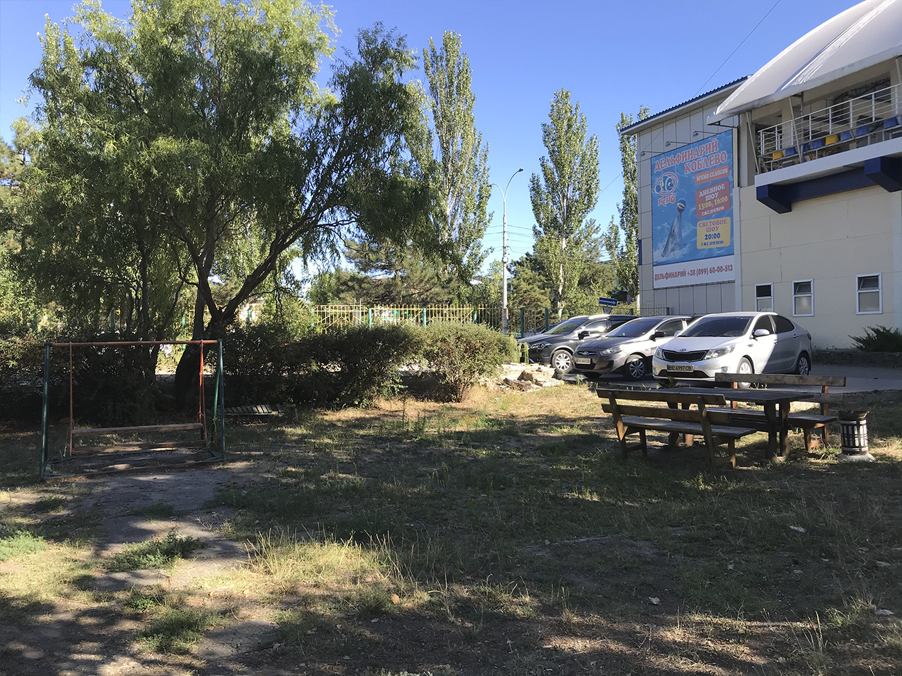 Большая ухоженная территория с удобным въездом для транспорта — это предлагает туристам пансионат Олимп в Коблево. Есть стоянка для автомобилей. Вокруг здания пансионата Олимп тенистый дворик с беседками и столиками из натурального дерева. Стоит отметить, что там можно спрятаться от палящего солнца. Прежде всего, есть зона для игр с малышами.