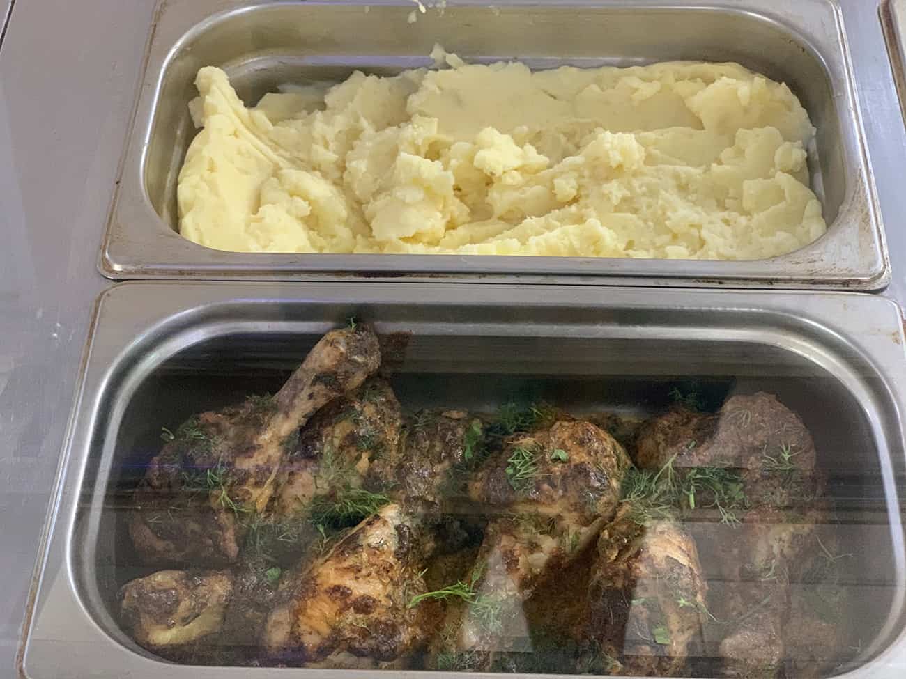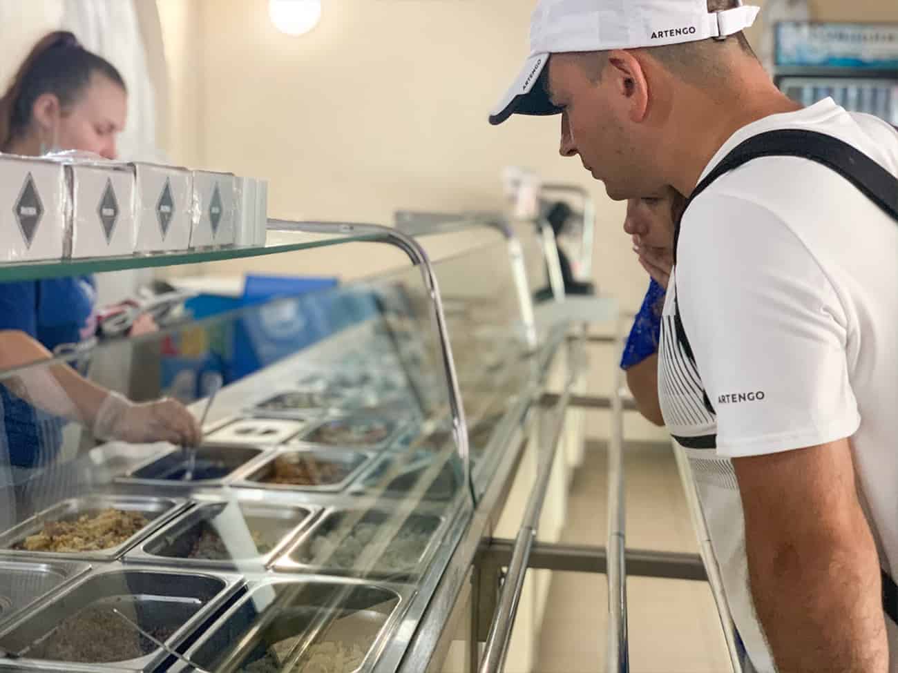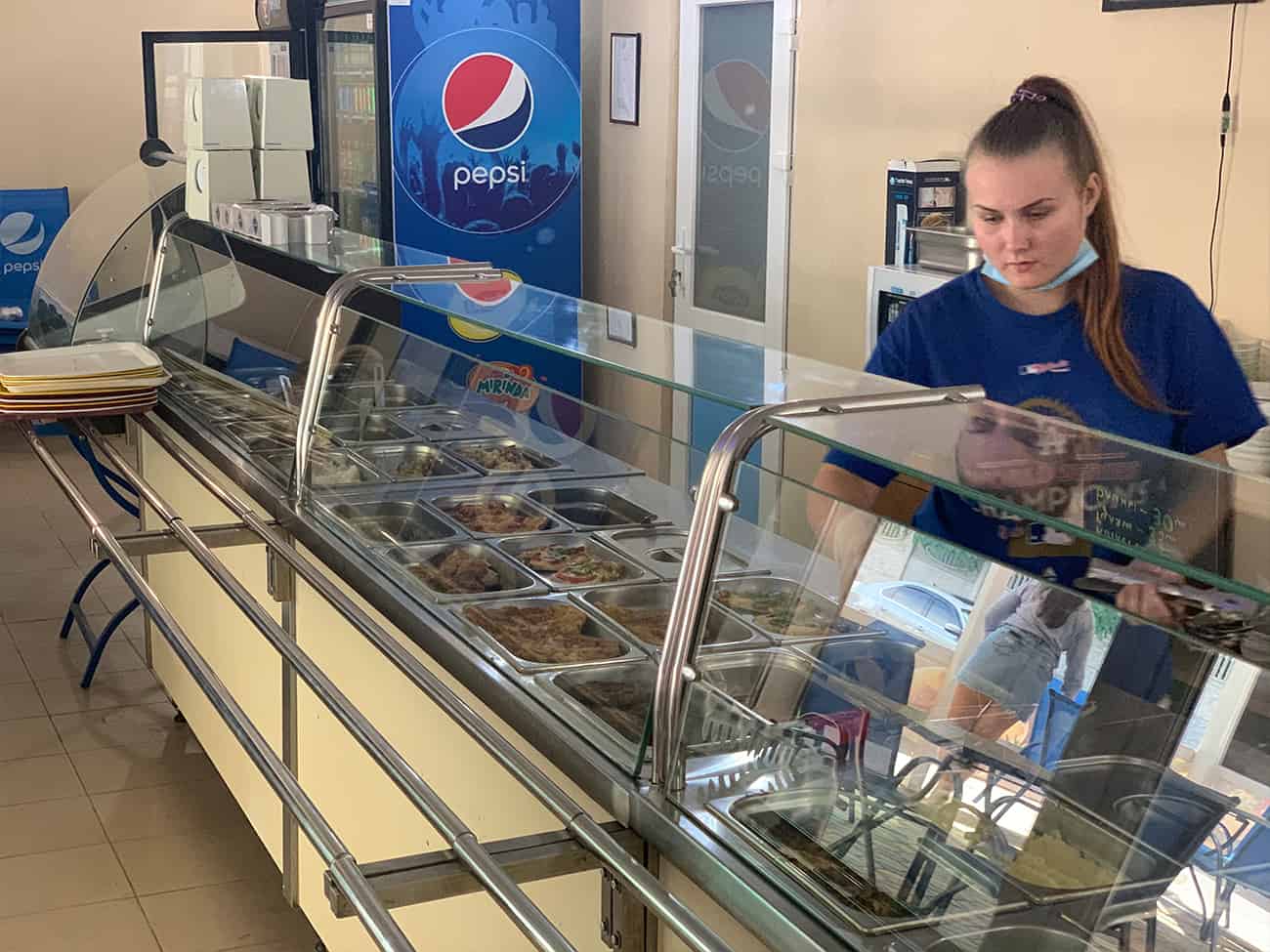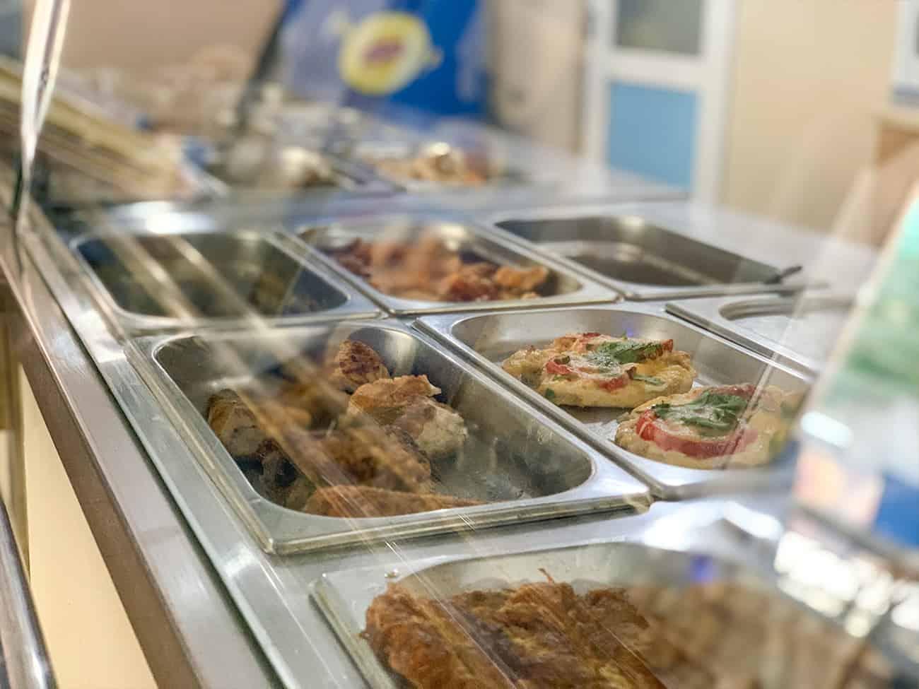 В кафе Домашняя кухня Самобранка в Коблево работает шведская линия раздачи. Само помещение небольшое, но в нем, безусловно, достаточно места для большого количества туристов. Оно поделено на две зоны. В одной вы заказываете еду и расплачиваетесь, а в другой — располагаетесь за столиками.