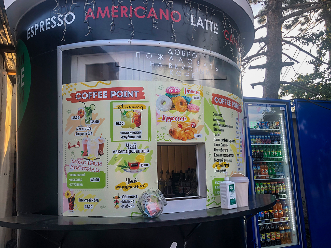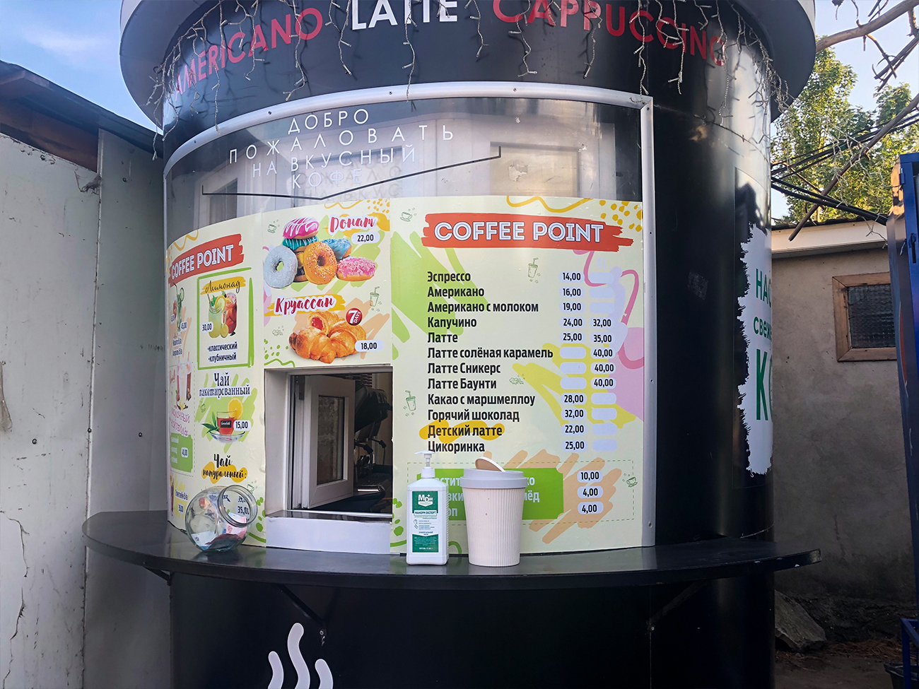 Кофейня Coffee Point в Коблево выглядит очень интересно. Корпус помещения имеет форму большого стакана для кофе. Заказать напиток можно через окошко. Кстати, выпить его можно тоже здесь, не отходя от кофейни. Здесь предусмотрено место, где можно поставить стаканчики и поболтать с друзьями в ожидании всего заказа. А также возле окошка есть антисептическое средство для рук. Им могут воспользоваться все посетители.