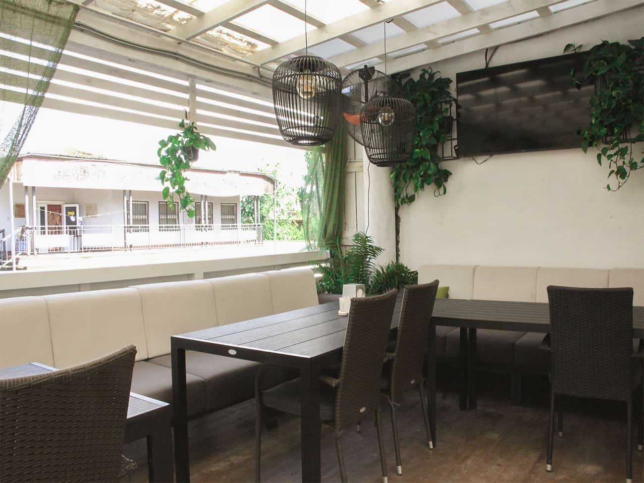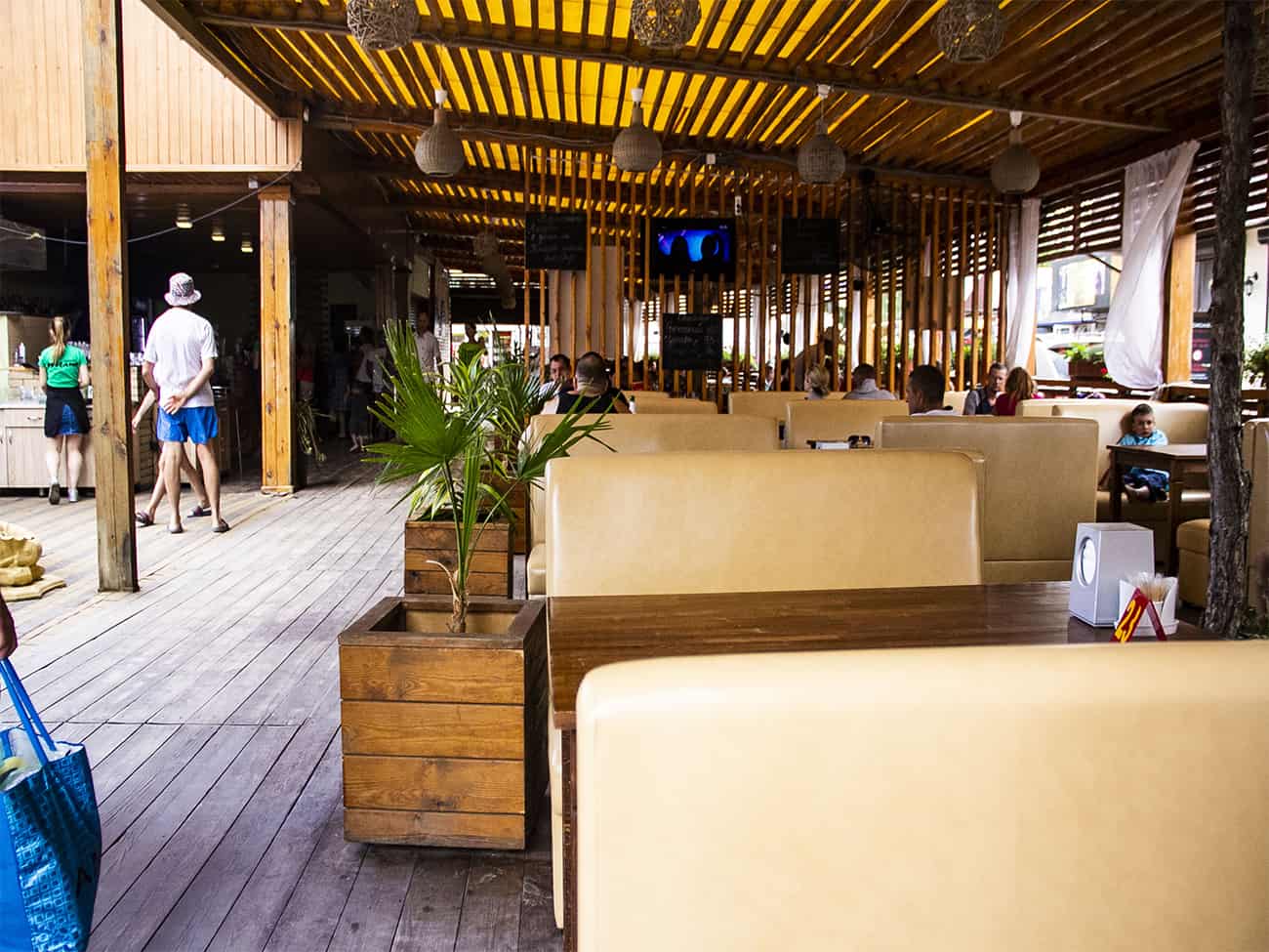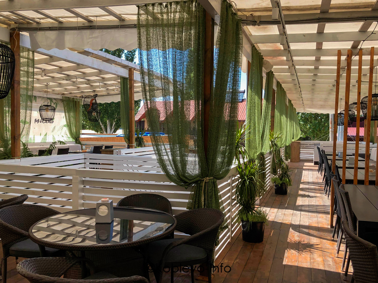 Интерьер ресторана отлично сочетает в себе темные и светлые тона с яркими акцентами. На втором этаже много живых цветов. Ресторан Милано открытого типа бесспорно станет идеальным укрытием от палящего солнца. Свежий воздух морского бриза создает комфортную прохладу внутри даже в самый жаркий день. Кроме того, в заведении есть вентиляторы.