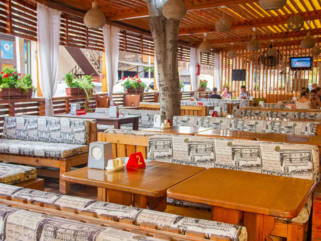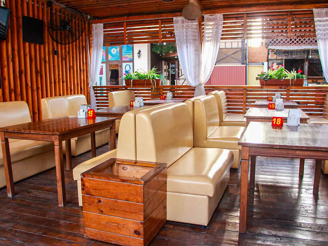 Прежде всего, маленькие гости не заскучают в ресторане, для них обустроена детская игровая комната на первом этаже. В дневное и вечернее время суток атмосфера здесь достаточно разная. Днем играет ненавязчивая легкая музыка, а отдыхающие заходят на завтраки и обед. Ну, а с первыми красками заката прекрасным дополнением вечера становится живая музыка в исполнении резидента ресторана Светланы. Иначе говоря, ресторан плавно превращается в зажигательную дискотеку.