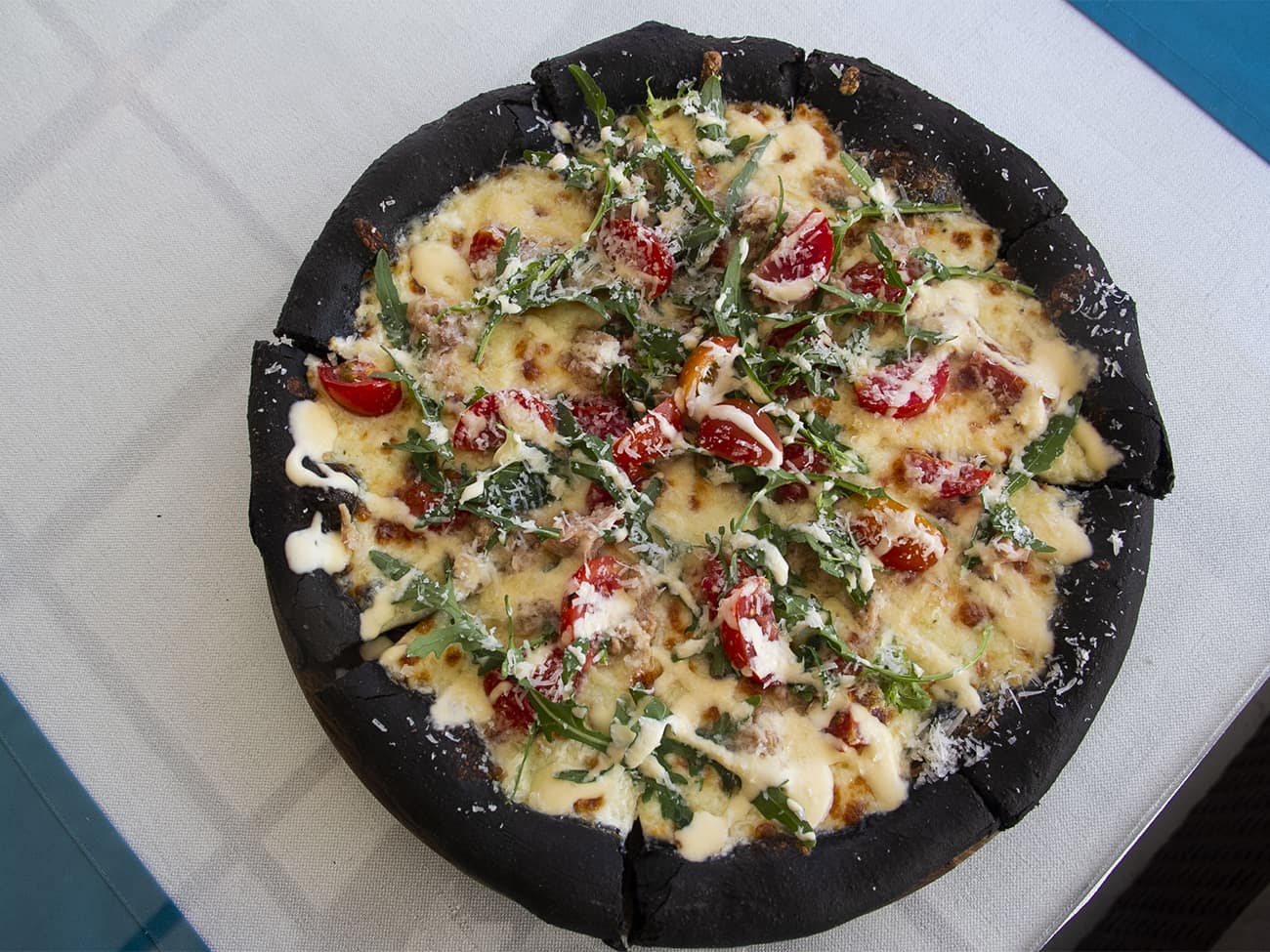 • ПИЦЦА С ТУНЦОМ И РУККОЛОЙ НА ЧЕРНОМ КОРЖЕ — тунец, соус Цезарь, моцарелла, пармезан, черри