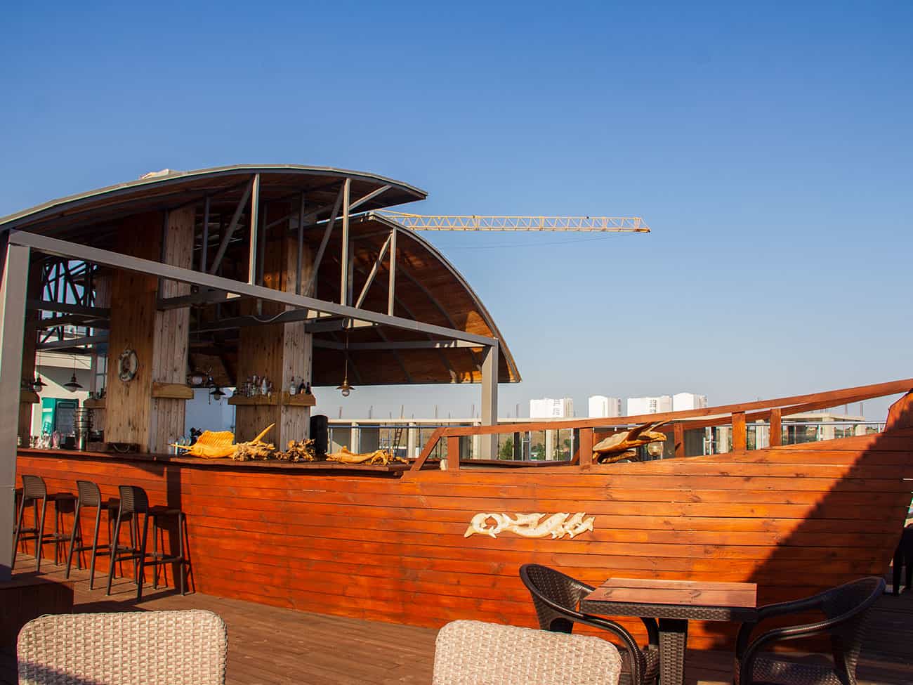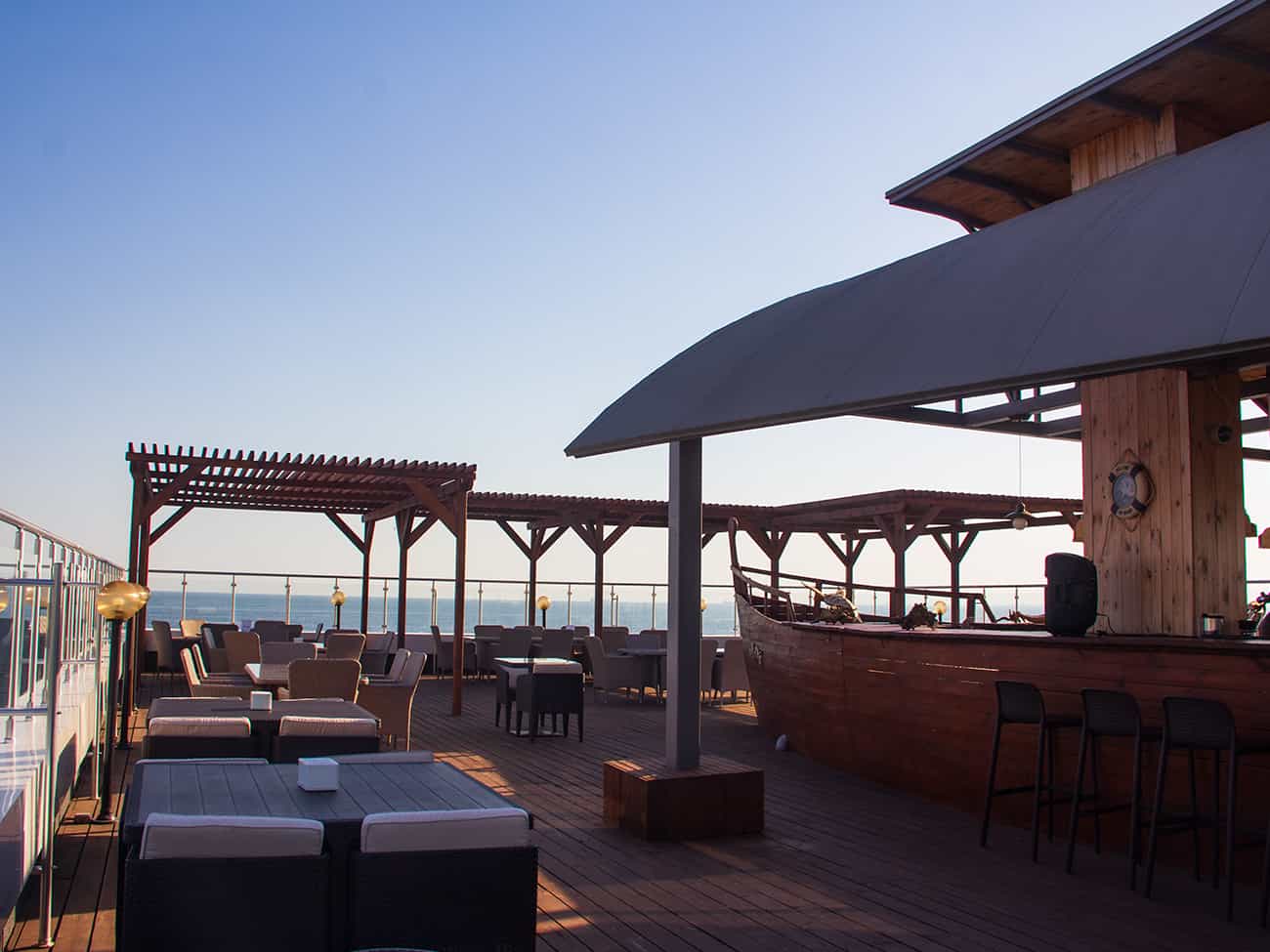 Из ресторана открывается потрясающий вид на море. Конечно же, прочувствовать всю атмосферу удастся именно в вечернее время. Именно тогда вы сможете понаблюдать за красивейшим закатом и сполна насладиться красотой вечернего курорта. Ресторан Небо в Коблево располагает отличным интерьером. В качестве декора использованы различные детали, которые относятся к морской тематике. Здесь, несомненно, все продумано до мелочей. А сам ресторан, безусловно, может стать отличным местом для фотосессии. Особенного внимания стоит барная стойка. Она сделана в форме корабля.