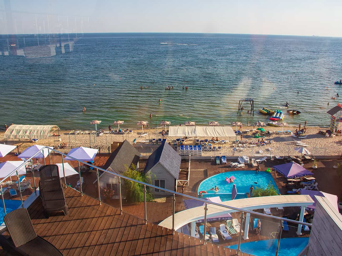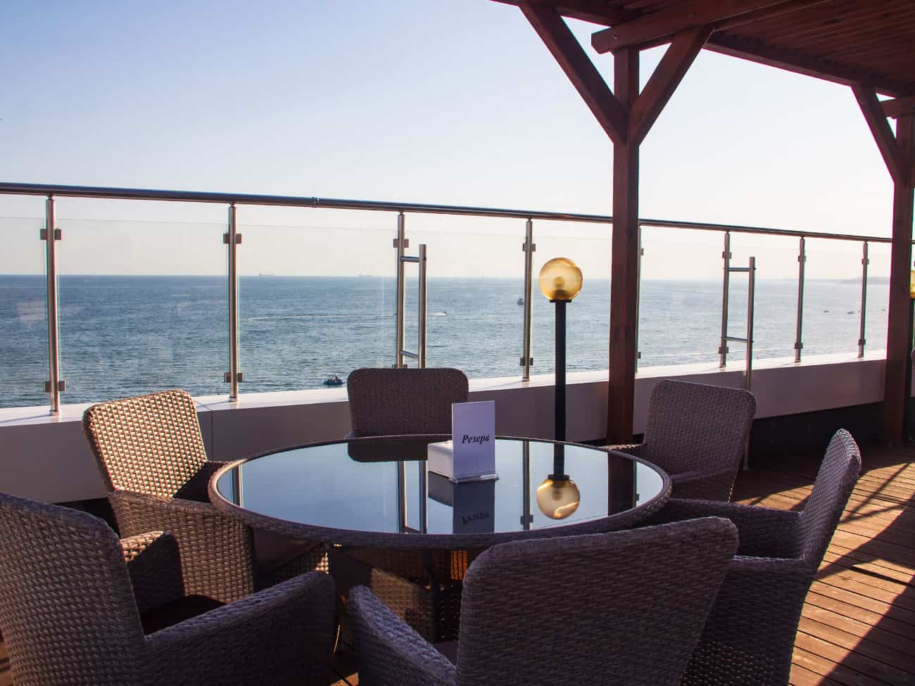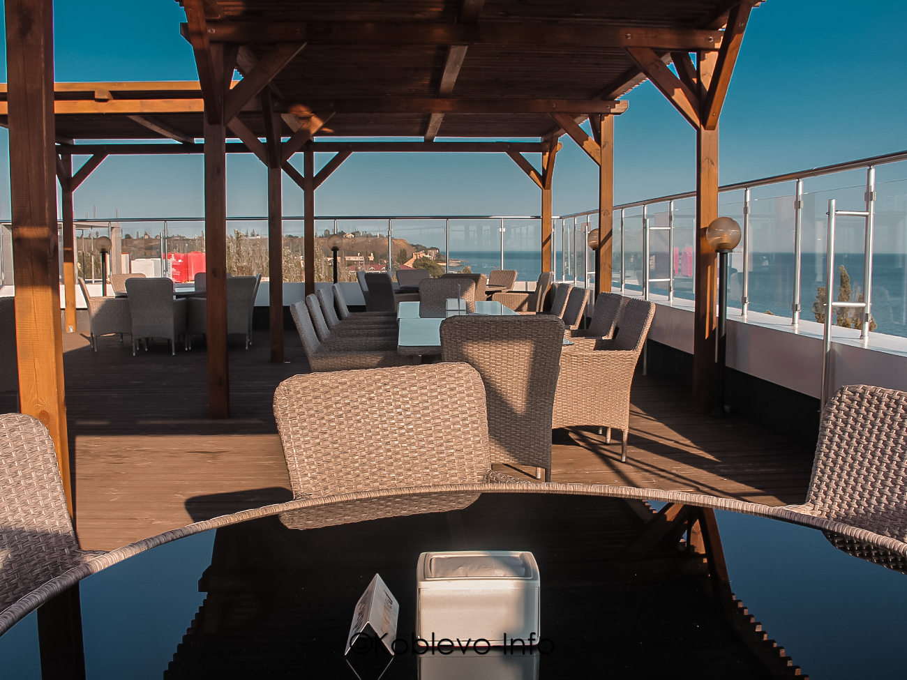 Более того, в ресторане вы найдете множество мелочей в интерьере вроде сеток с ракушками и статуэток в виде морских обитателей. Цветовая гамма в дизайне ненавязчивая. Все оформлено в спокойных теплых тонах. Здесь, безусловно, приятно проводить время за бокалом вина или за сытным ужином в кругу семьи. Несмотря на то, что ресторан Небо в Коблево находится на крыше, ветра здесь практически нет. Все потому, что по периметру заведения установлены стеклянные ограждения, которые, кстати, совсем не закрывают вид. Часто ресторан выбирают в качестве места для проведения торжественных событий или дней рождения.
