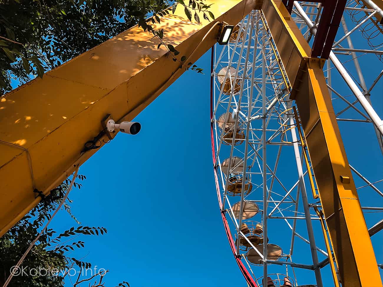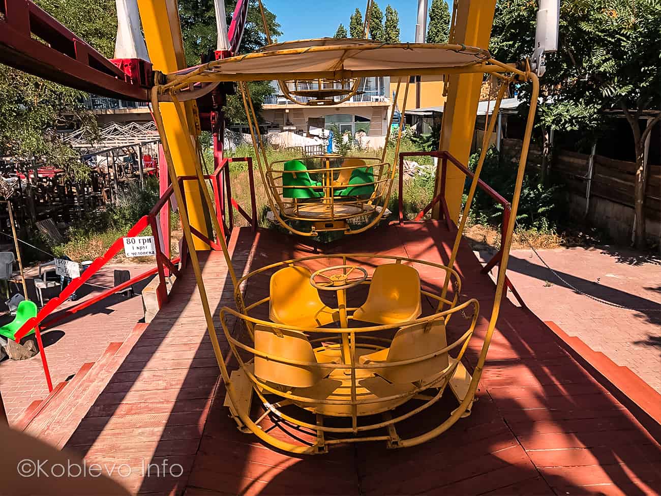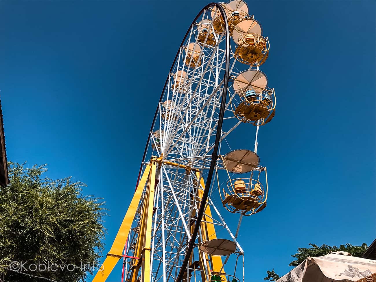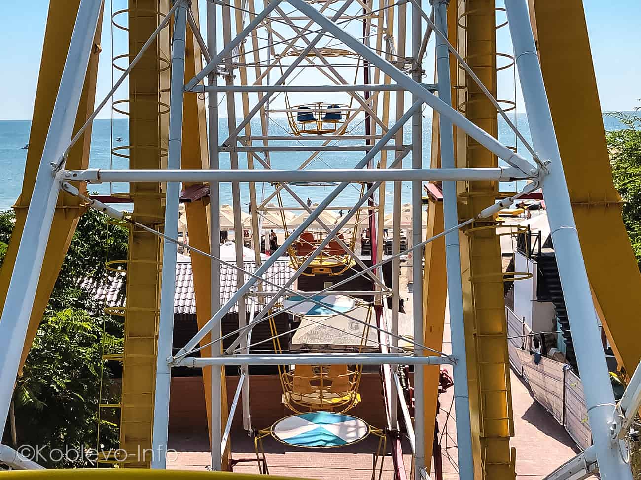 Колесо обозрения, или как привыкли в народе «чертово колесо», работает на протяжении всего летнего сезона с утра и до позднего вечера. Сама конструкция была собрана Ейским заводом аттракционов в 1990 году. Высота чертового колеса достигает 28 метров. То есть у каждого есть возможность прокатиться на этом аттракционе и увидеть красоту Коблево и близлежащих окрестностей с такой высоты. В диаметре колесо около 24,5 метра. По времени один полный круг занимает 6 минут.