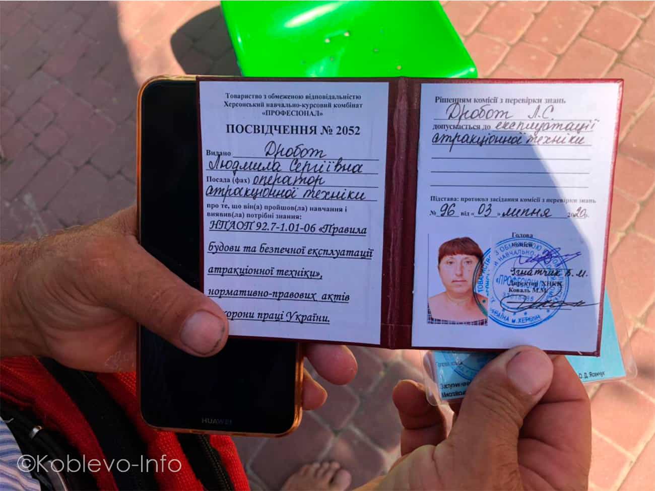 Кроме того, у работников аттракциона есть вся необходимая документация. Это касается как документов на колесо обозрения в Коблево, так и удостоверения и разрешения на работу оператора аттракционной техники.