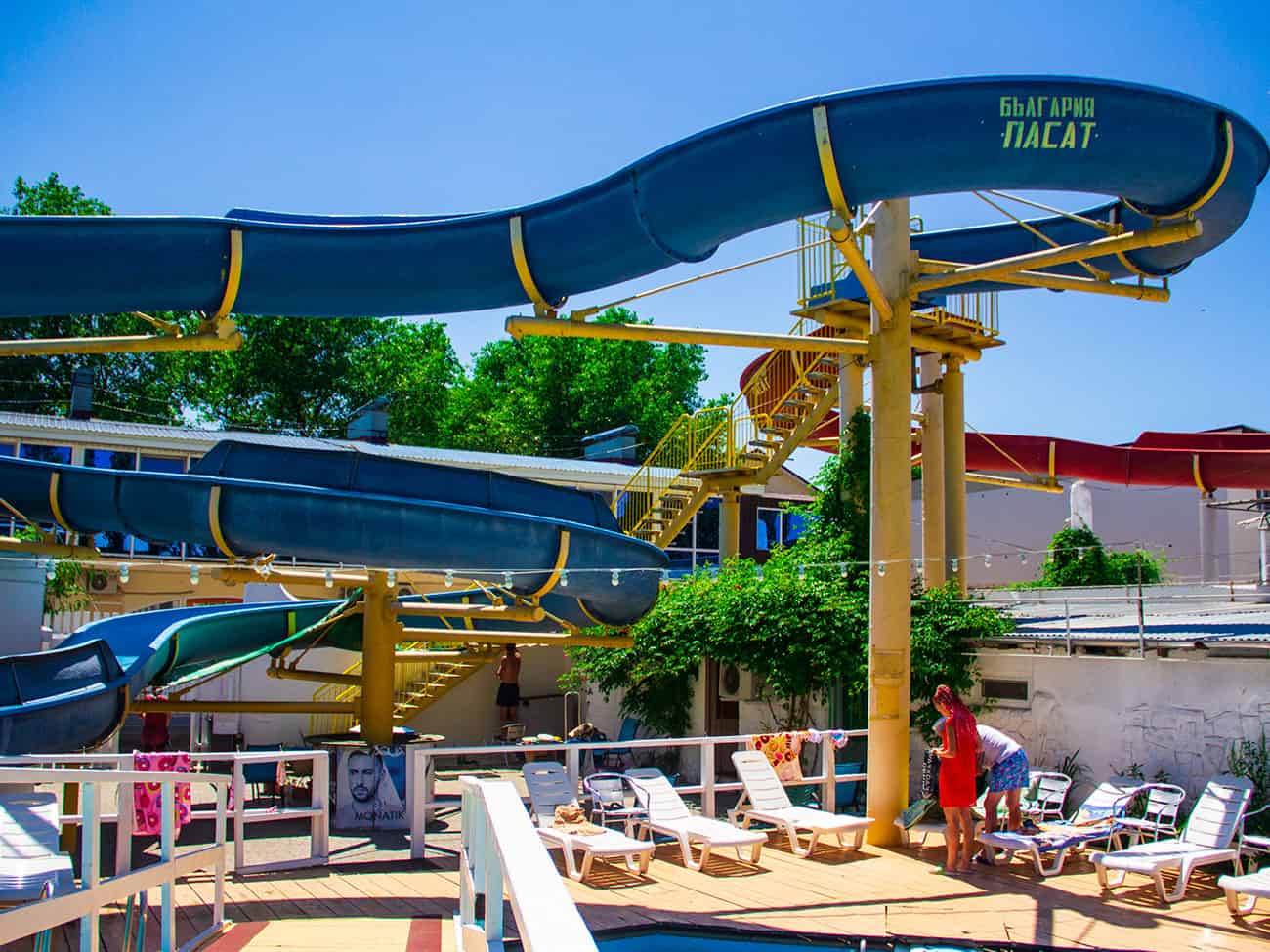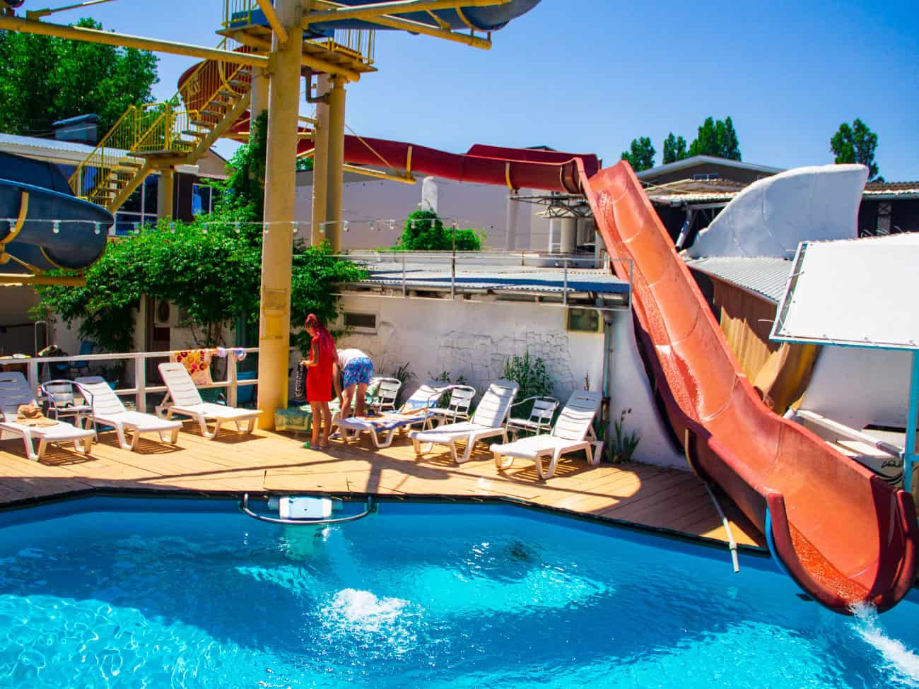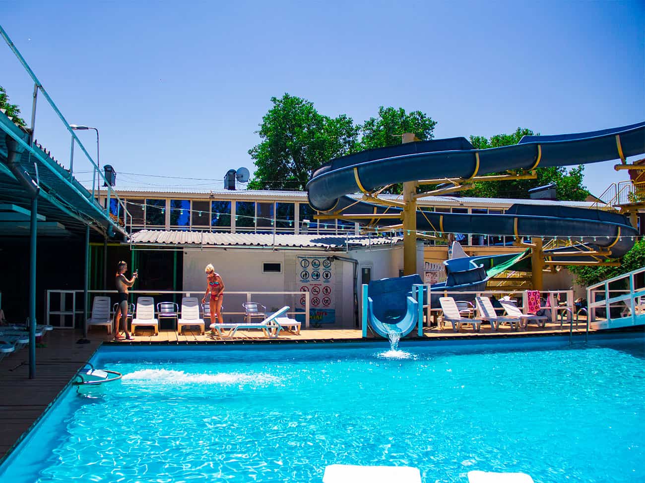 Кроме того, они окружают как раз мини-аквапарк. Поэтому, лежа на шезлонге и наслаждаясь освежающим напитком, можно еще и заказать какое-либо блюдо. То есть у каждого есть возможность провести здесь целый день, балуя себя различными прелестями отдыха. Кстати, бассейн здесь очищают два раза в день, его глубина составляет 1,20м. Поэтому переживать о его чистоте не стоит, она под полным контролем. Сам же мини-аквапарк на Акватории вкуса в Коблево располагает двумя горками. Они немного похожи друг на друга, но все же отличаются скоростью спуска в воду.