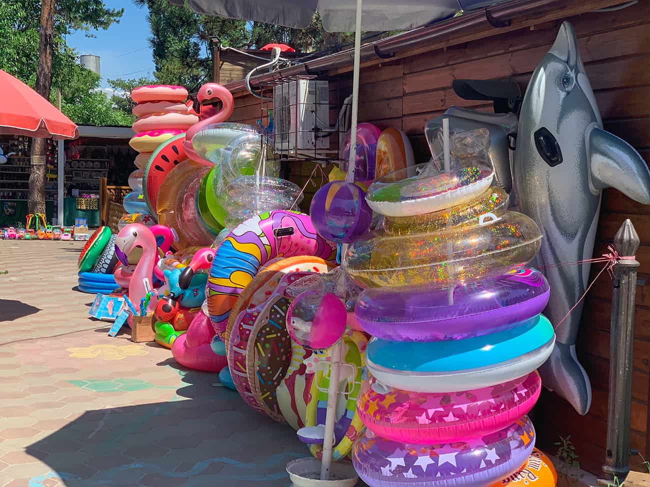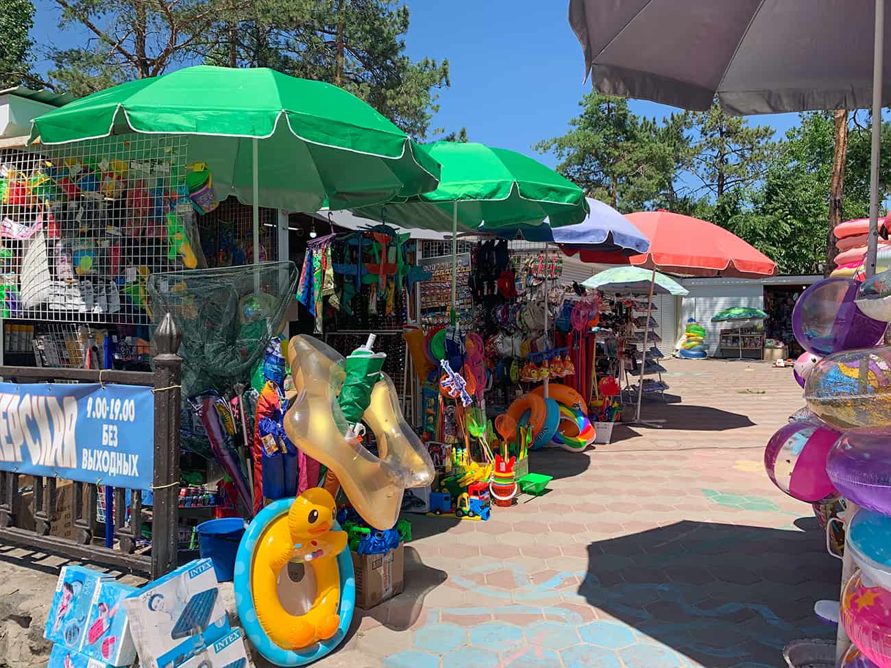 Рынок возле базы отдыха Ракета в Коблево представляет собой большое количество павильонов с ассортиментом товаров разного назначения. Все они относятся, конечно же, к пляжным аксессуарам и принадлежностям. Здесь вы найдете как детские игрушки, так и большой выбор аксессуаров для туристов постарше. Безусловно, здесь продают популярные среди отдыхающих любого возраста надувные круги и матрасы. Есть даже необычные круги в виде фламинго или других представителей фауны. То же касается надувных матрасов и многого другого. Все это как раз и пользуется наибольшим спросом.