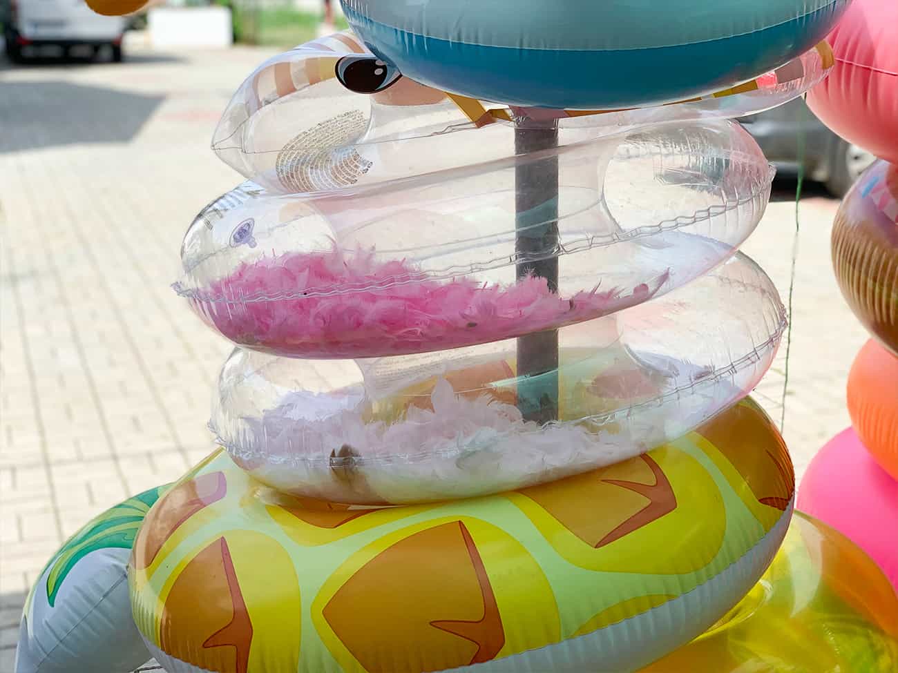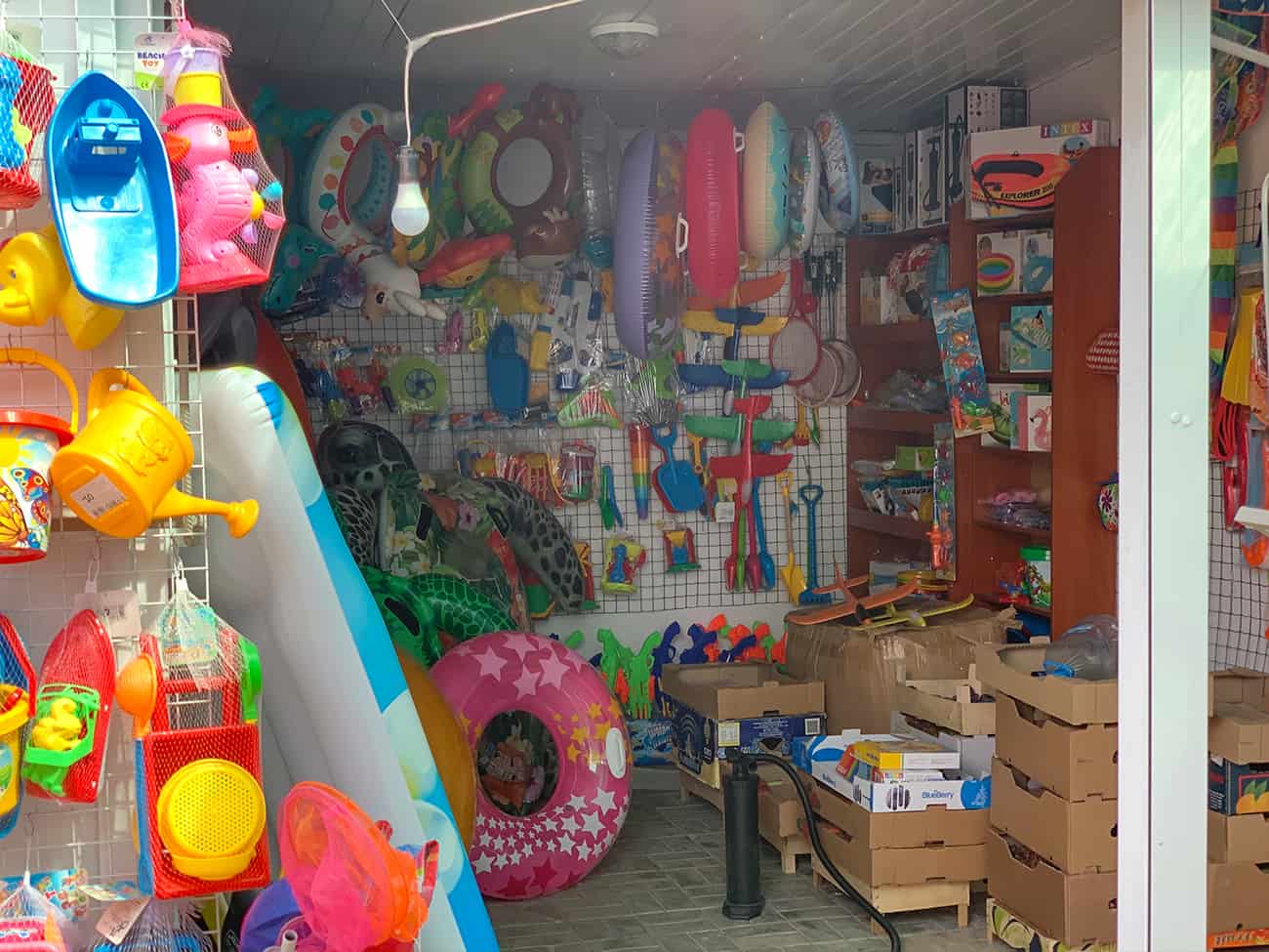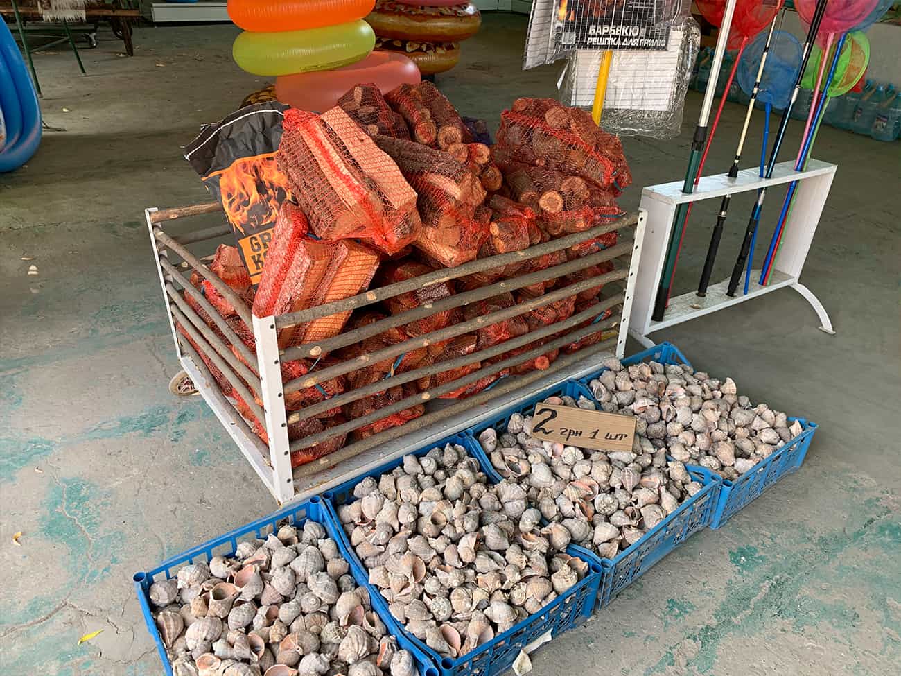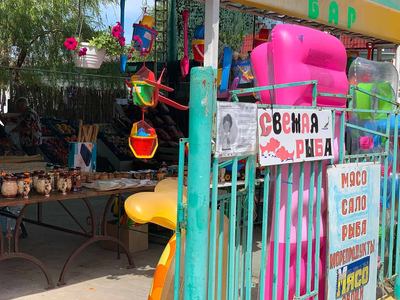 Софиевский рынок в Коблево, как уже упоминалось, поделен на множество отделов с разного рода товарами. Есть. безусловно, и продуктовые. Там в основном продают мясо, фрукты и овощи и восточные сладости. Но на территории работает еще и небольшой магазин с продуктами и напитками. Также есть точки с пляжными принадлежностями. К ним относятся надувные круги, матрасы, жилеты и многое другое. Кроме того, здесь же есть отдел с детскими игрушками, в том числе и теми, которые предназначены для игр на пляже.