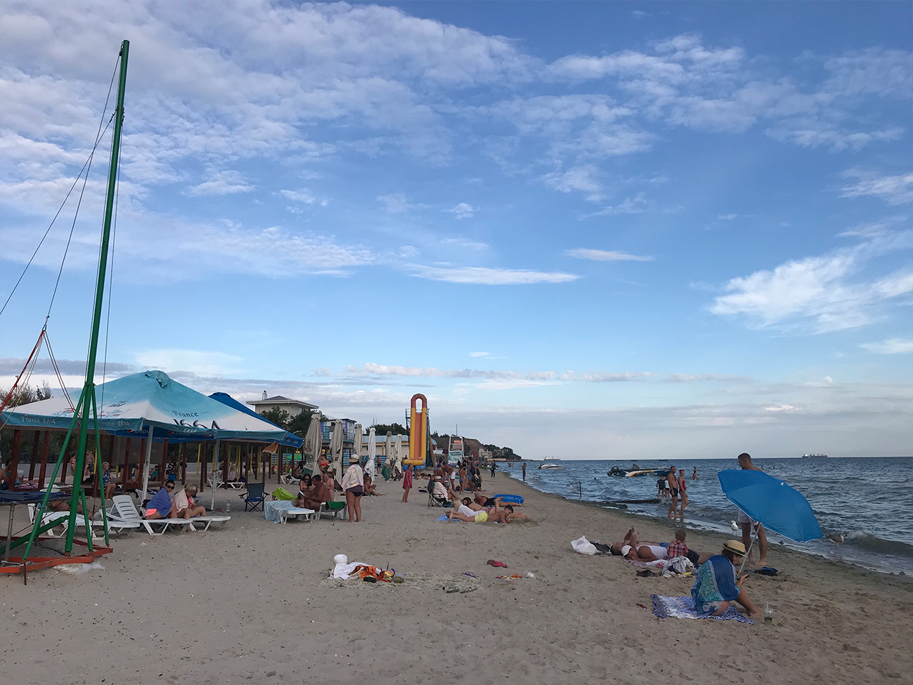 В Коблево 20.08.2020 было все-таки очень тепло. Хотя солнце часто уходило за облака, но на общей атмосфере это никак не сказалось. Наоборот, тенек всегда кстати. Особенно тем, кто привык целый день проводить на пляже. И температура воздуха тоже была подходящей — 29 градусов по Цельсию. Отличная погода, здесь не поспоришь.