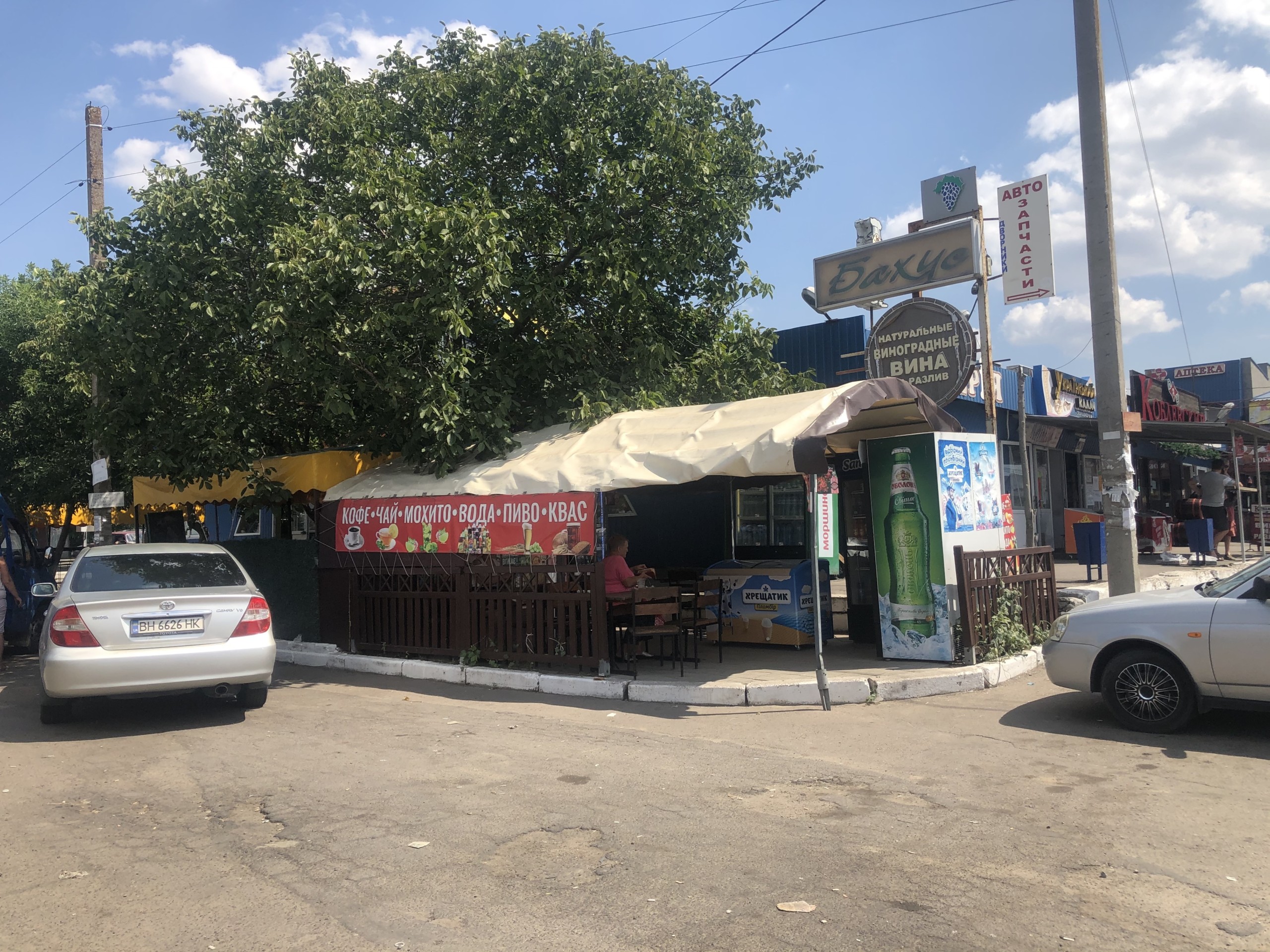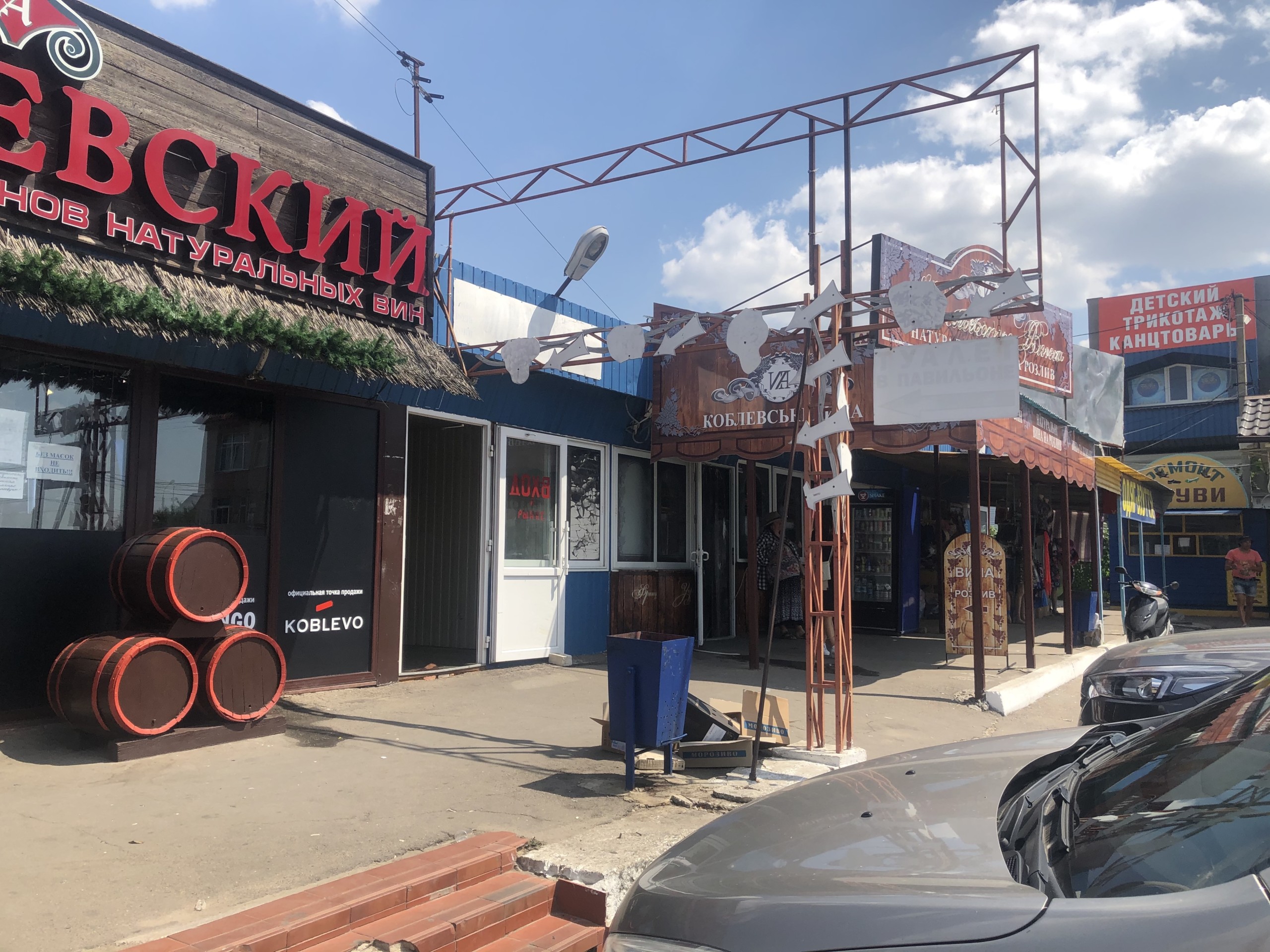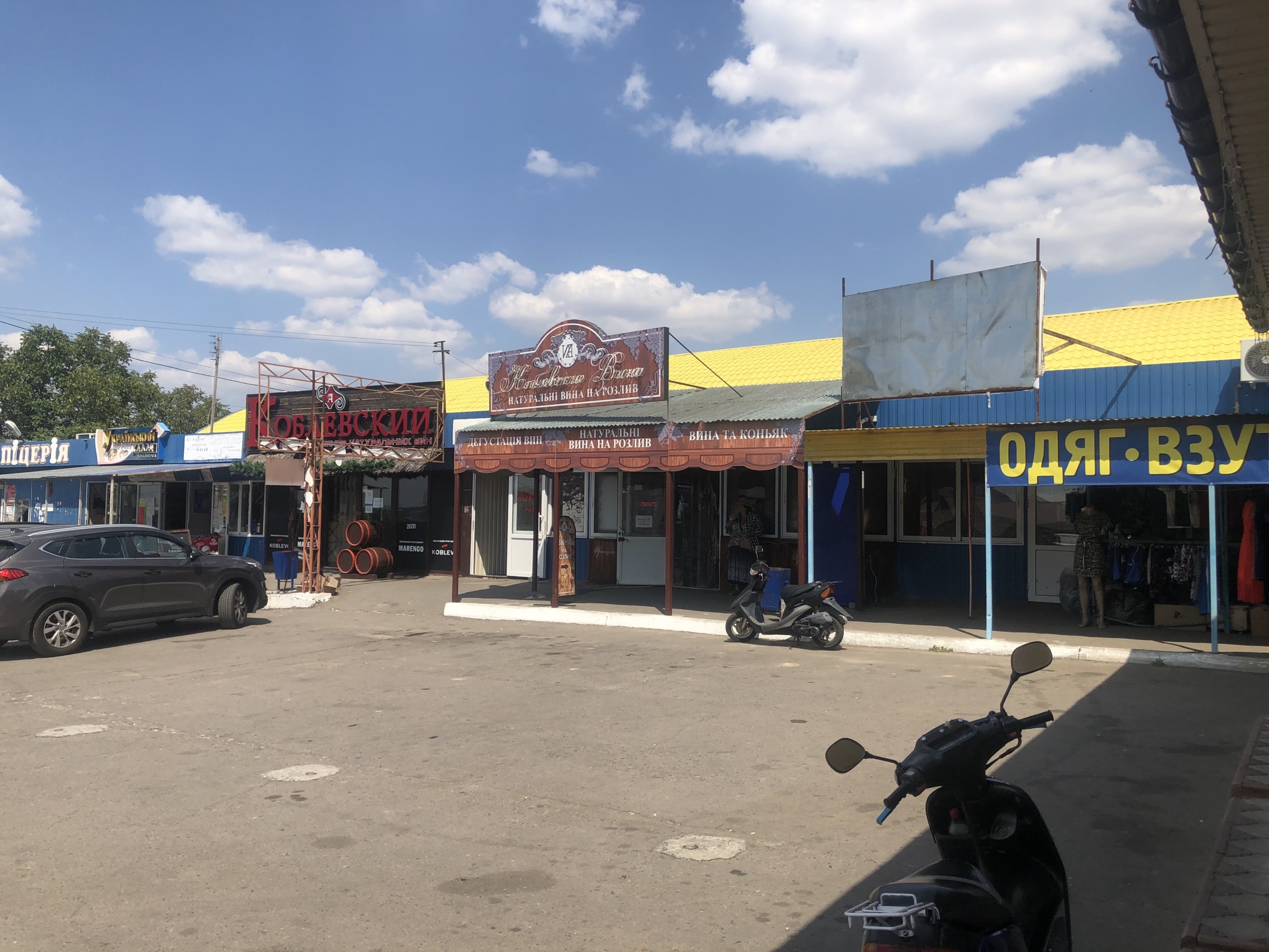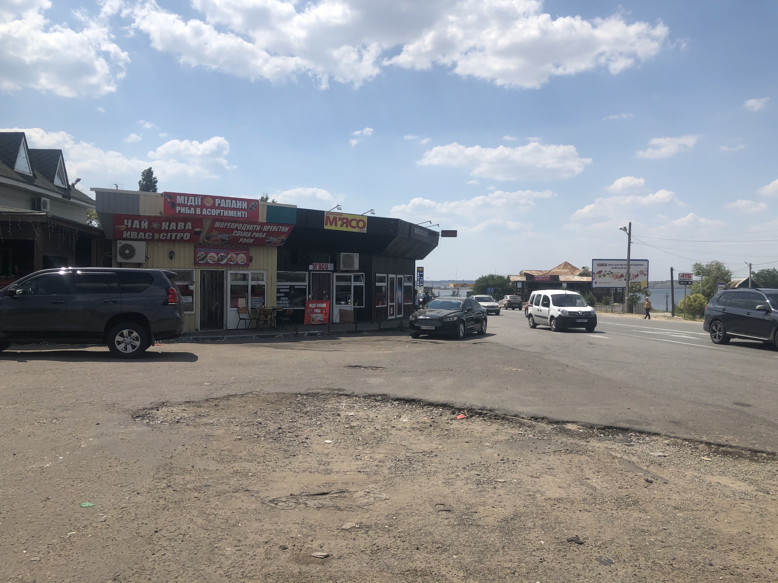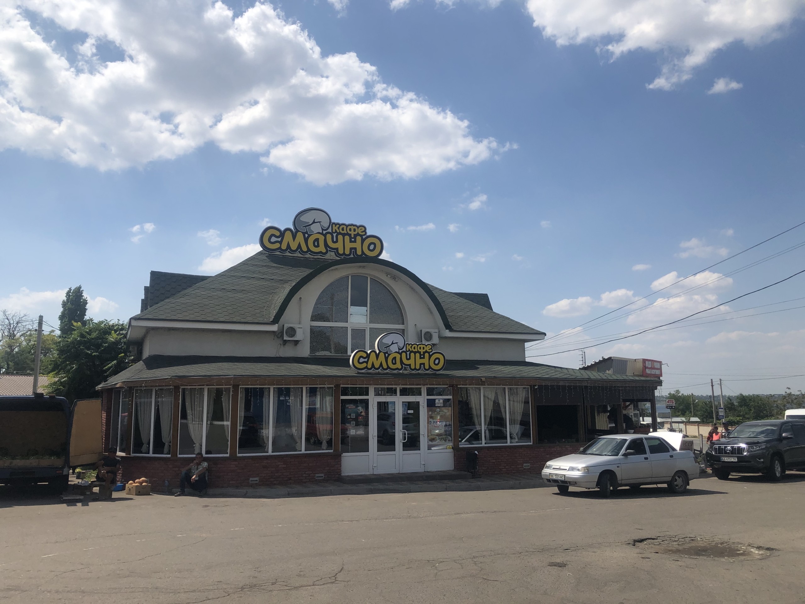 Кстати, нам сегодня удалось посетить не только территорию курорта, но и выехать за ее пределы. Мы побывали возле Автостанции №1 в Коблево 08.08.2020 и запечатлели обстановку там. Нам удалось сфотографировать площадь возле кафе быстрого питания Смачно.